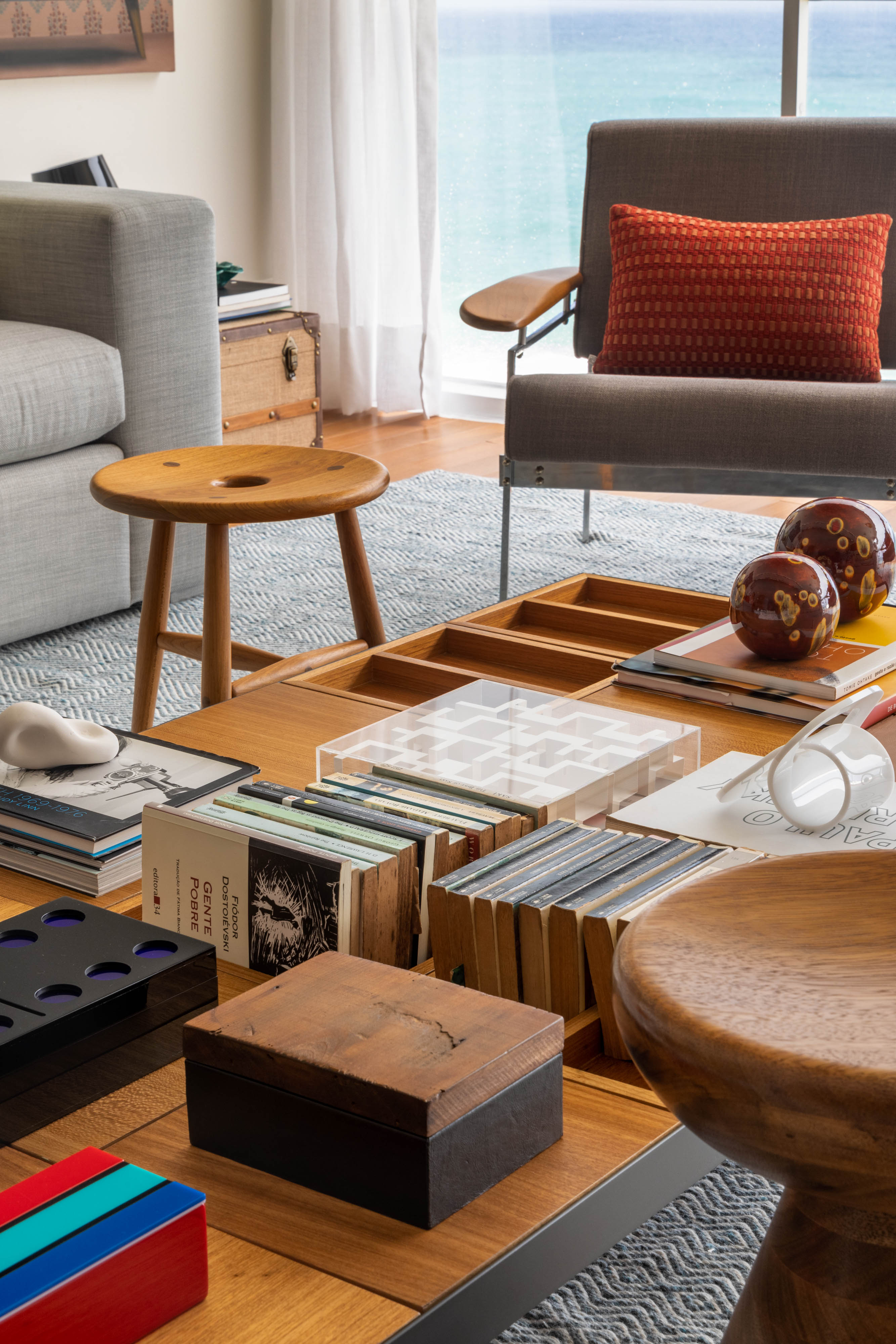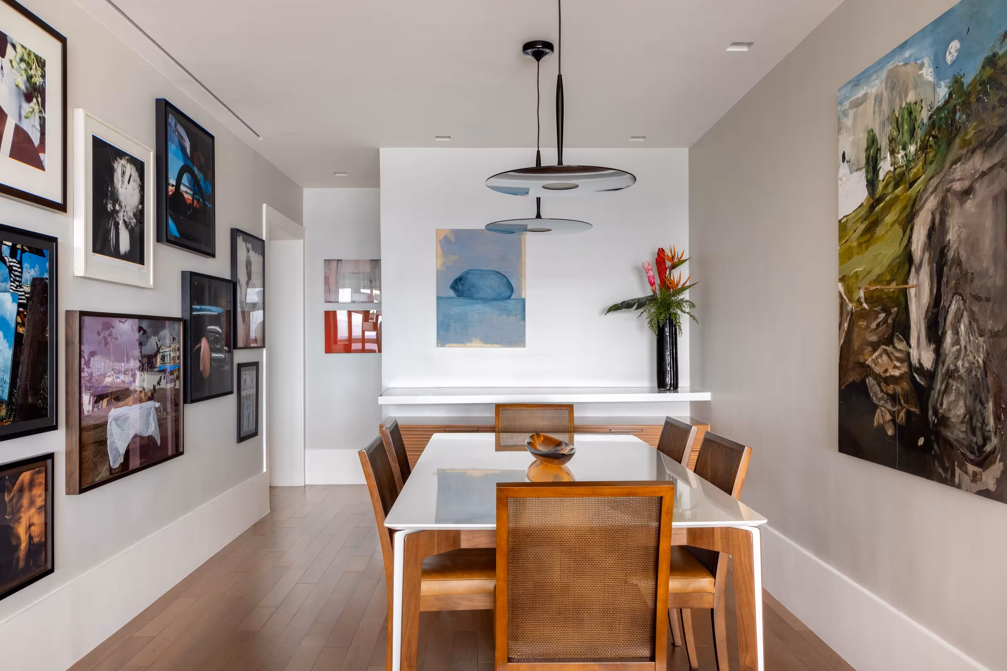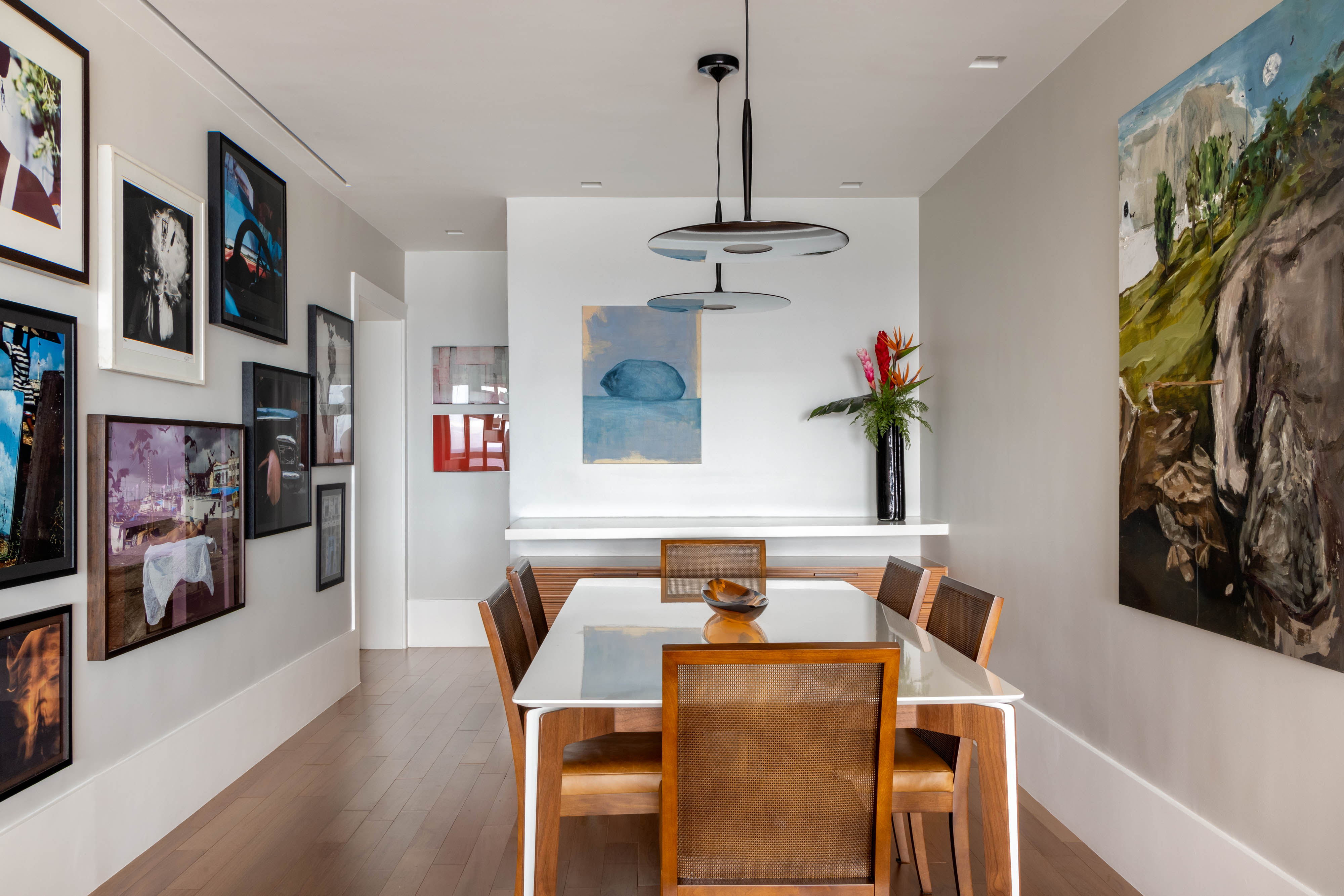 Logo na entrada, o visitante é envolvido por uma atmosfera calorosa e sofisticada. O piso em madeira aquece o ambiente, enquanto a marcenaria e o mobiliário em tons neutros servem de base para um importante acervo de obras de arte contemporânea, que se distribui pelas paredes e dialoga com o mar ao fundo.