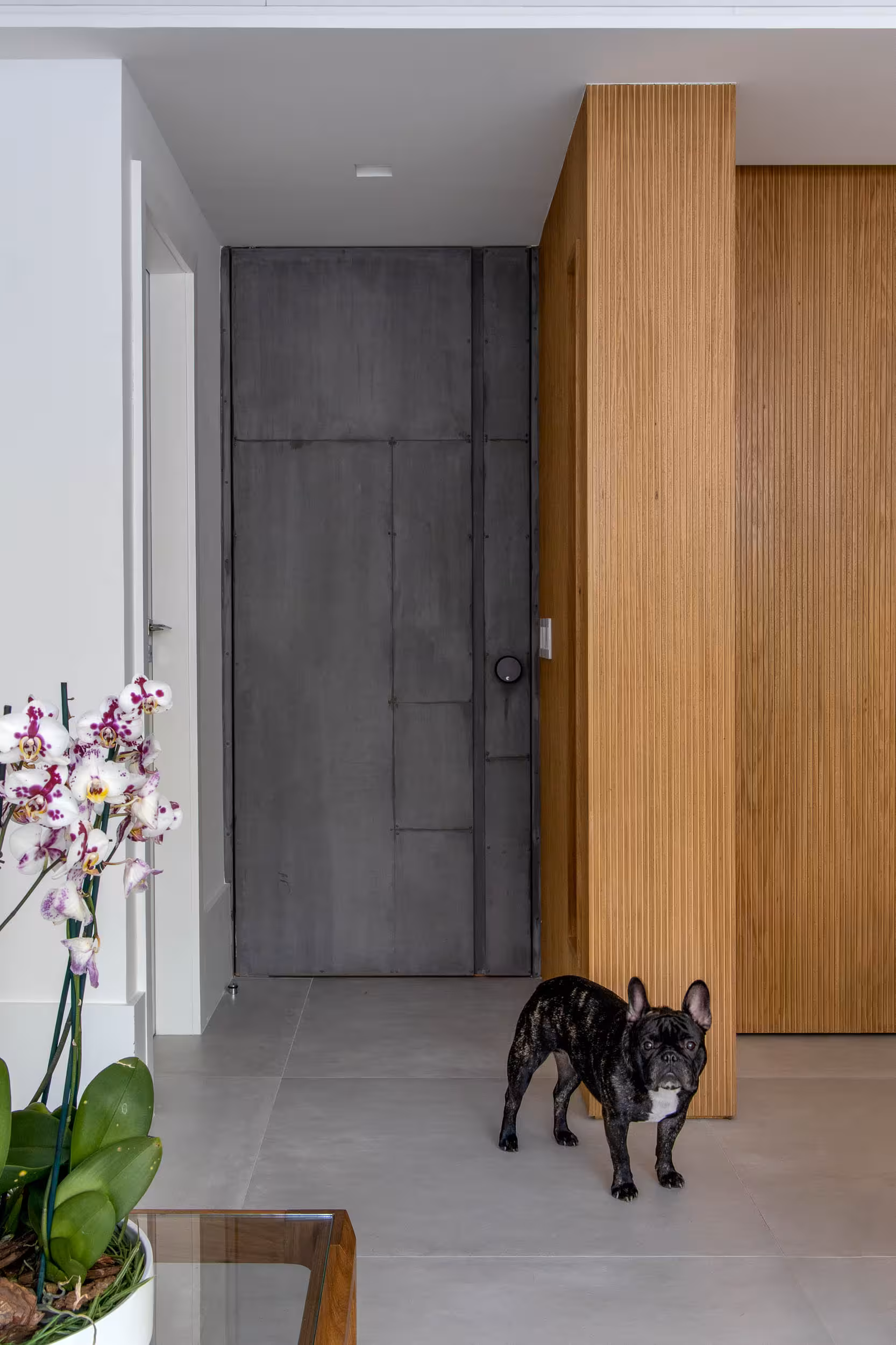 A marcenaria em freijó foi o elemento-chave do projeto, aparecendo em painéis, portas e mobiliário sob medida. Além de aquecer o ambiente, o material cria unidade visual entre os espaços e permite aproveitar cada centímetro do apartamento com soluções inteligentes de armazenamento.