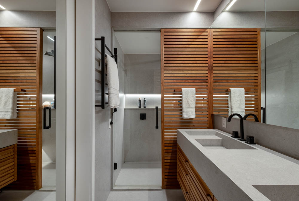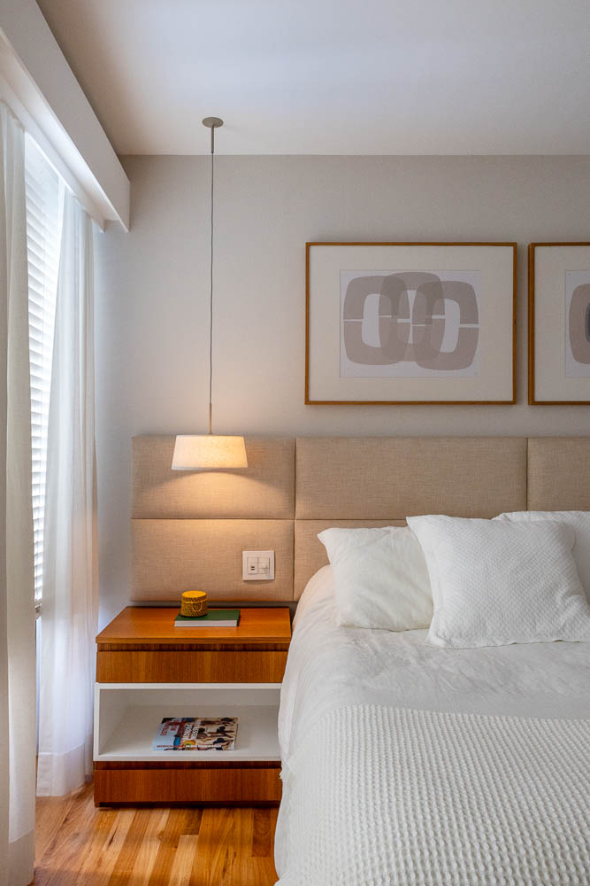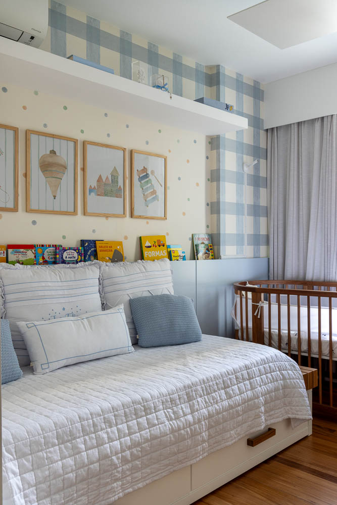 Na ala íntima, o quarto do filho foi decorado com o típico azul bebê enquanto a suíte do casal ganhou design funcional e uma paleta neutra. O banheiro foi totalmente reformulado com a instalação de uma grande bancada e uma charmosa veneziana de freijó na área molhada.