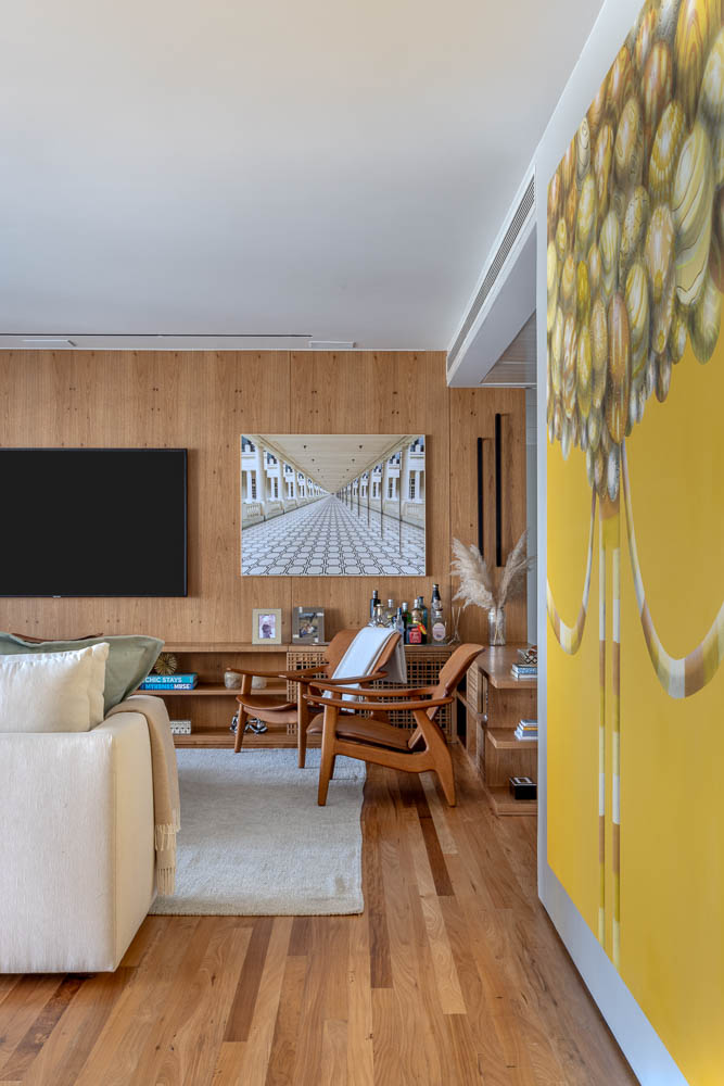 O destaque ali é a marcenaria que inclui um muxarabi em freijó que aparece tanto na divisória da varanda quanto nas portas do rack. Instalada somente nos dois cantos da sala, a peça, de correr, é usada no dia a dia para criar áreas de sombra em diferentes pontos do ambiente.