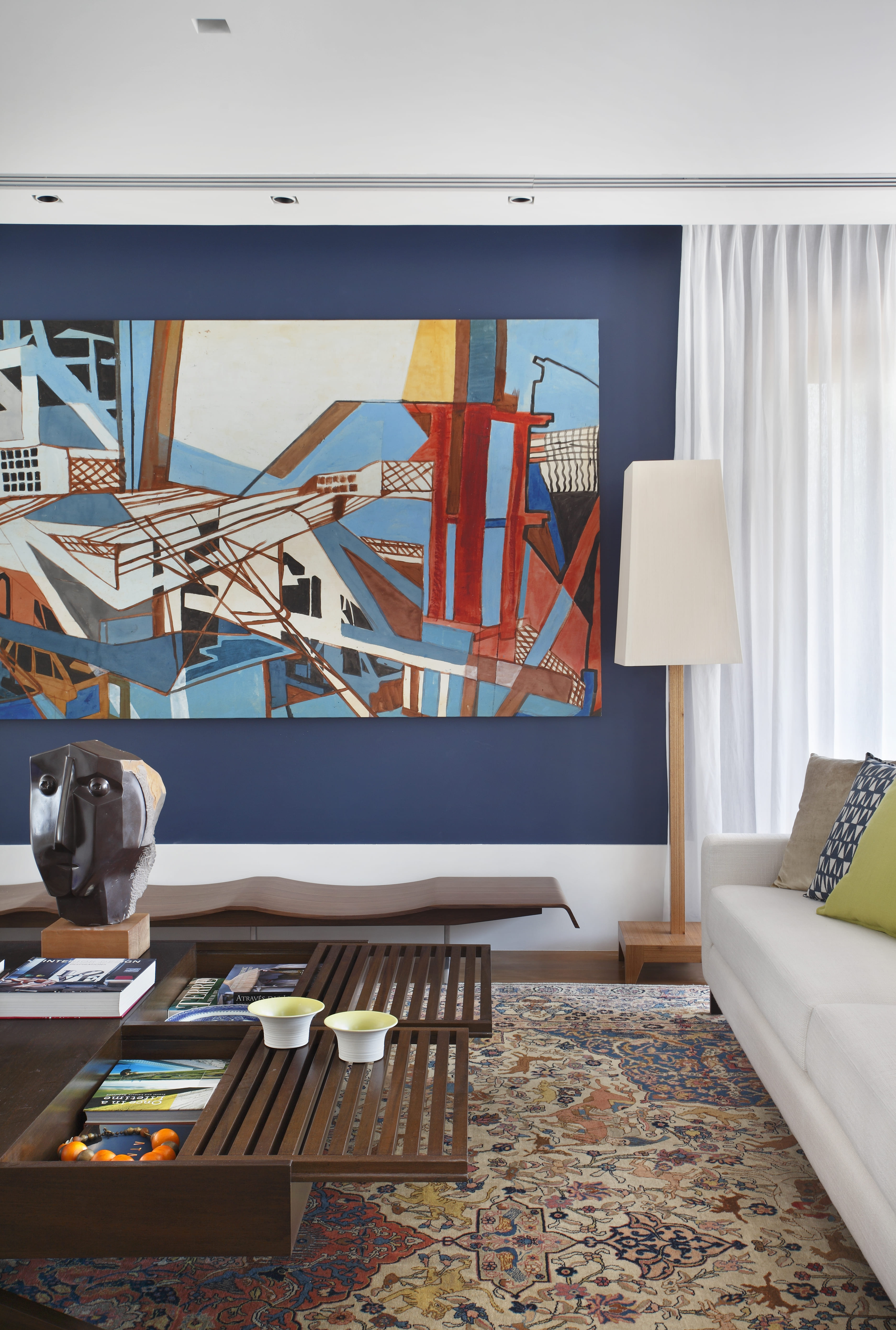 E o azul das peças também acabou influenciando algumas escolhas de cores da decoração, como se vê no estar, com paredes de um tom escuro, destacando os quadros, e no tapete do jantar. Neste cômodo, aliás, para posicionar o painel, que ocupa quase uma parede, Nóbrega teve de mudar de lugar a porta de um louceiro. Ali, novo e antigo se completam perfeitamente: na mesa com tampo marchetado que já pertencia ao morador e agora está cercada por cadeiras revestidas de couro, bem como nos aparadores de madeira suspensos, com divisórias em diferentes formatos, desenhados pelo arquiteto Isay Weinfeld para a Etel, que acomodam sopeiras da Companhia das Índias.