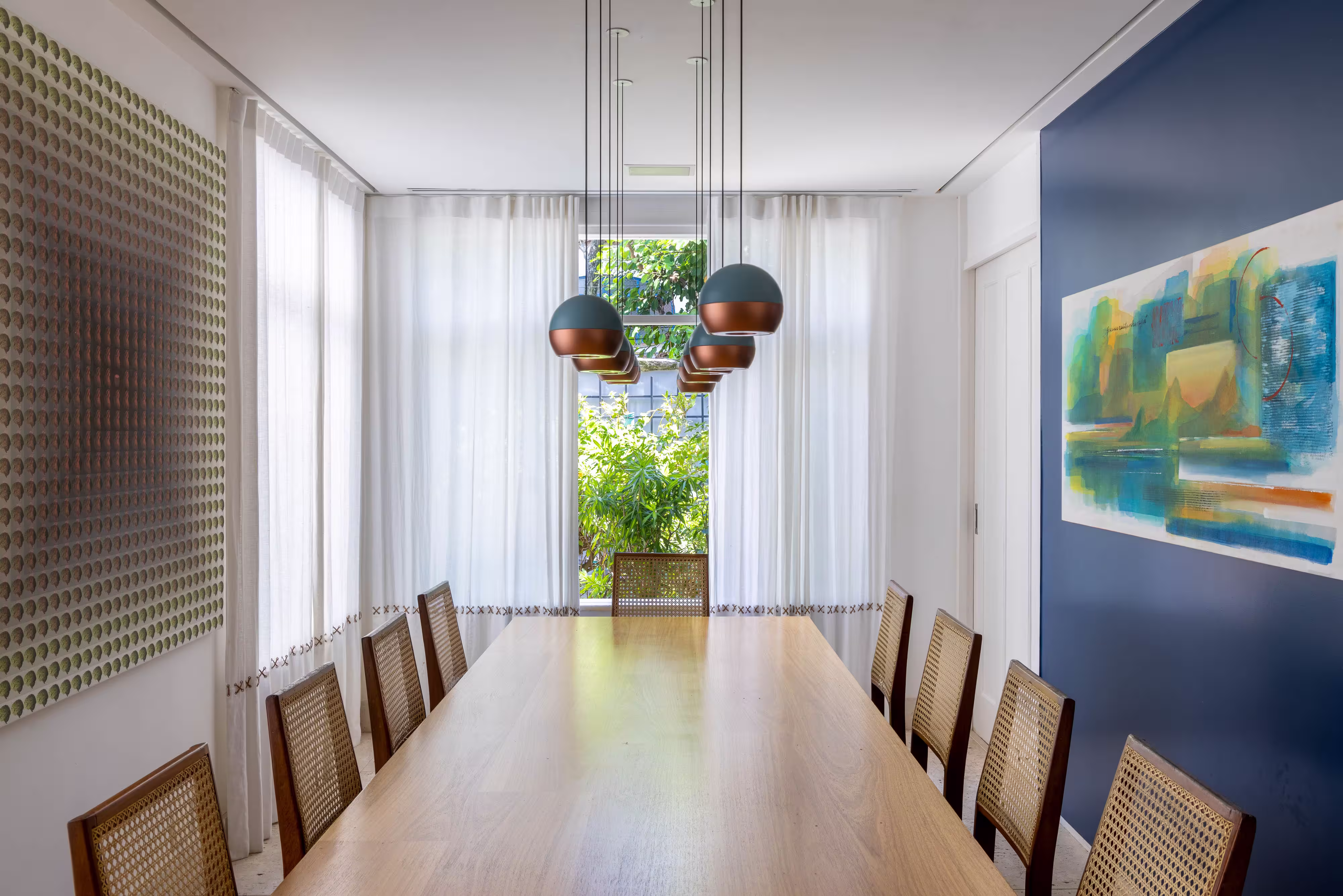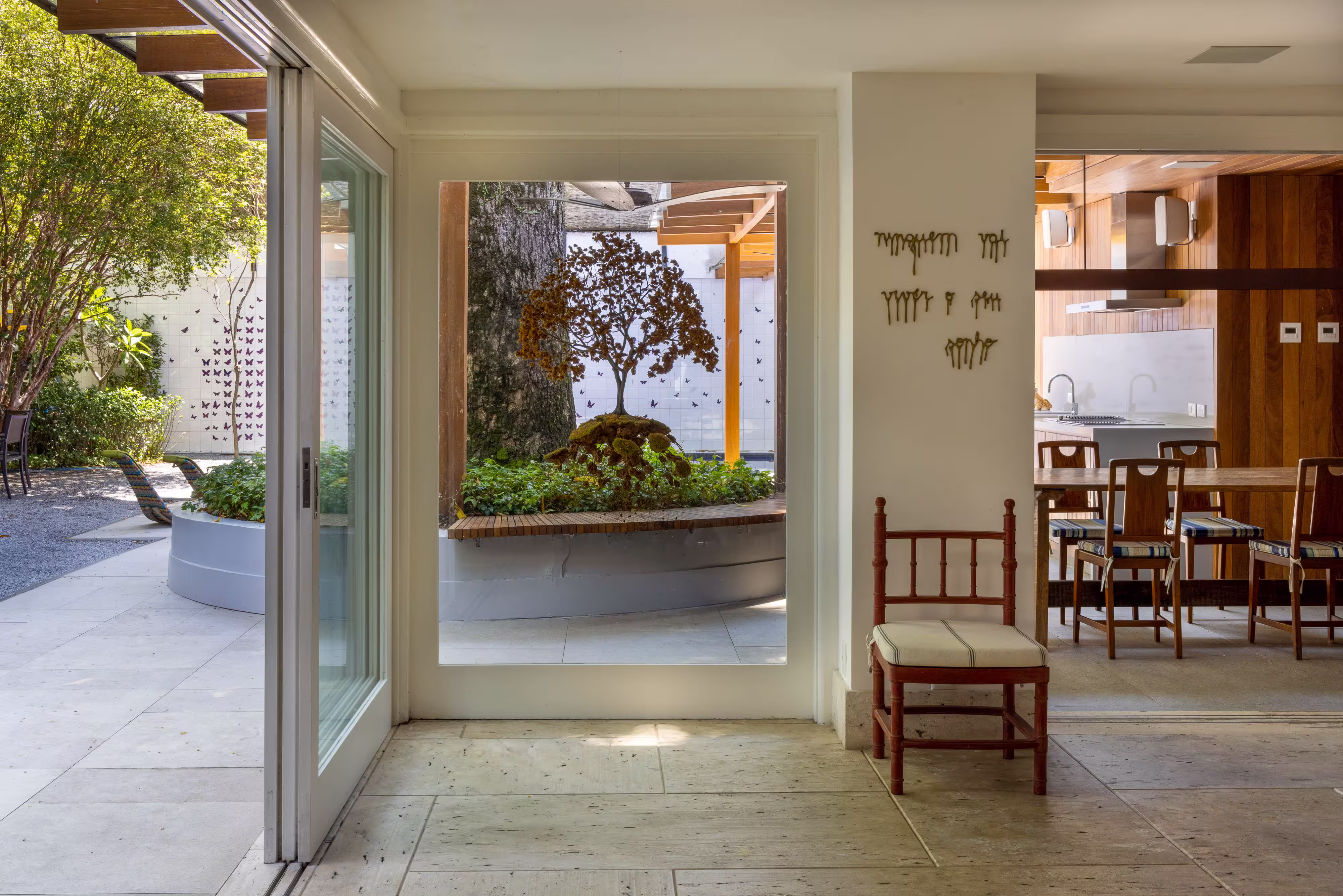 Já a ala social interna ficou com um estar amplo também conectado ao jardim. Ali, a decoração aproveitou tanto o mobiliário como as obras de arte e objetos que o casal já colecionava, dando ao ambiente a personalidade que a família tanto desejava.