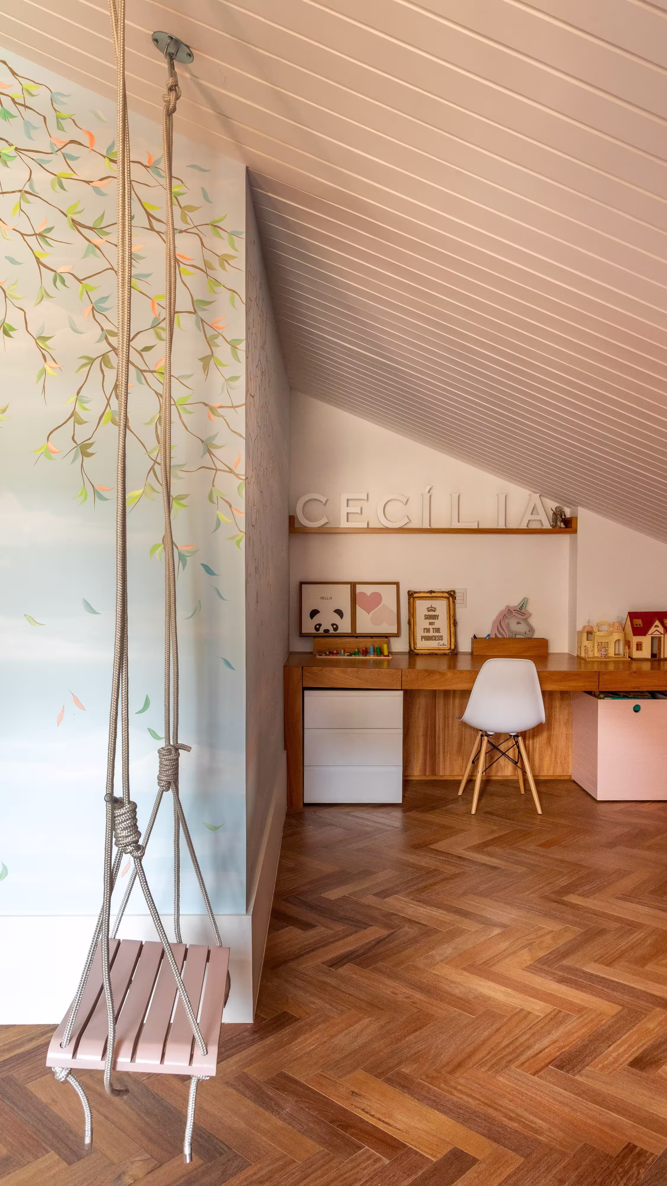 Outra modificação foi no porão. Usado pelos antigos moradores como uma sala de ensaios, o espaço foi transformado em um quarto de hóspedes apenas para as crianças. Mas que no dia a dia serve como uma family-room.