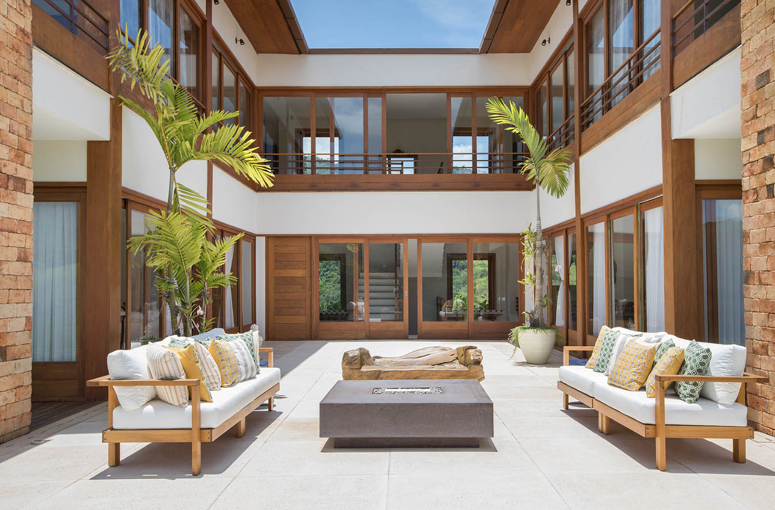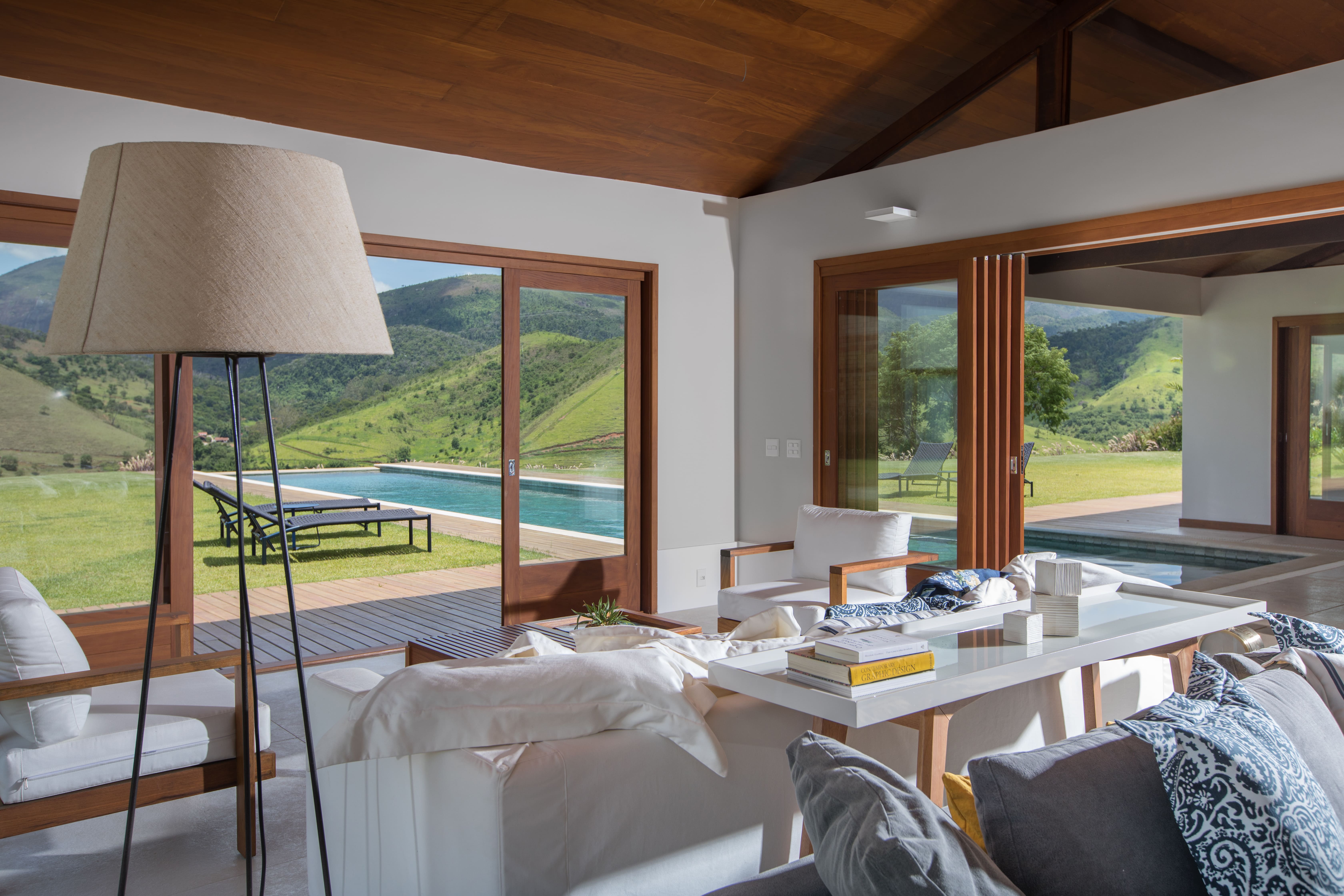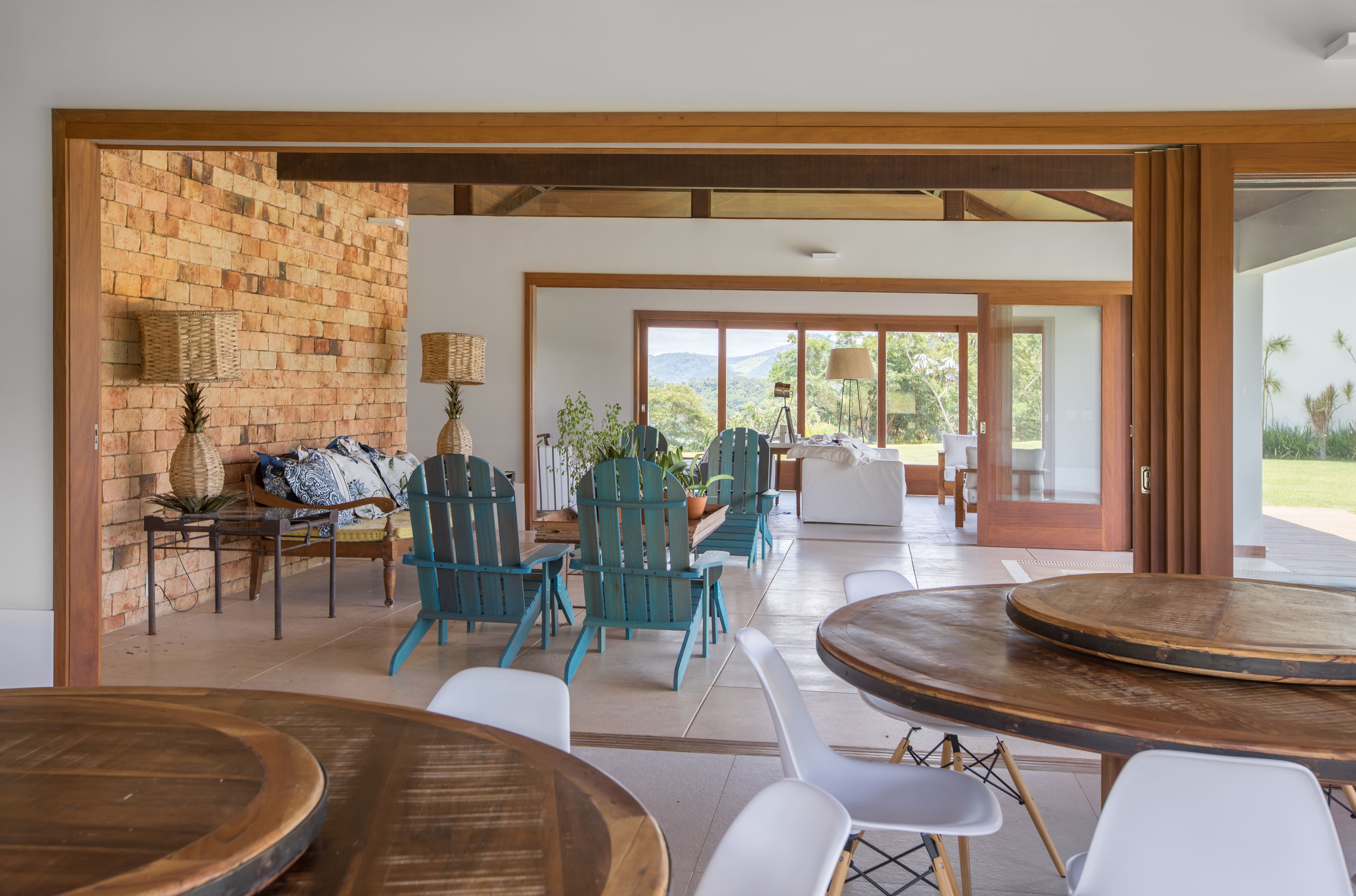 Os ambientes se abrem para o vale verde e as montanhas ao fundo, conectando interior e exterior de forma fluida. O mobiliário segue a mesma linguagem natural, com peças em madeira, fibras e tecidos crus, que complementam o visual orgânico e confortável da casa.