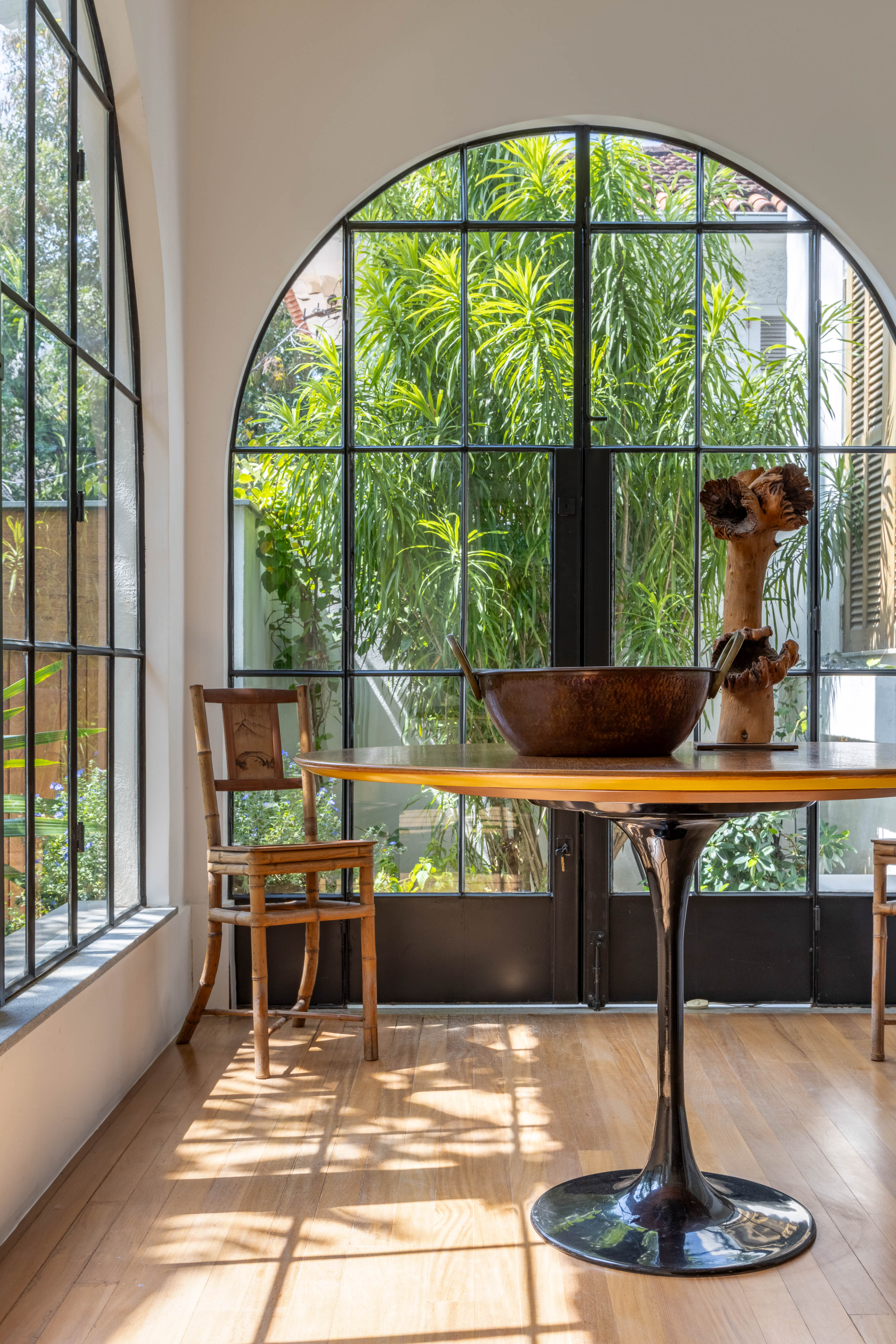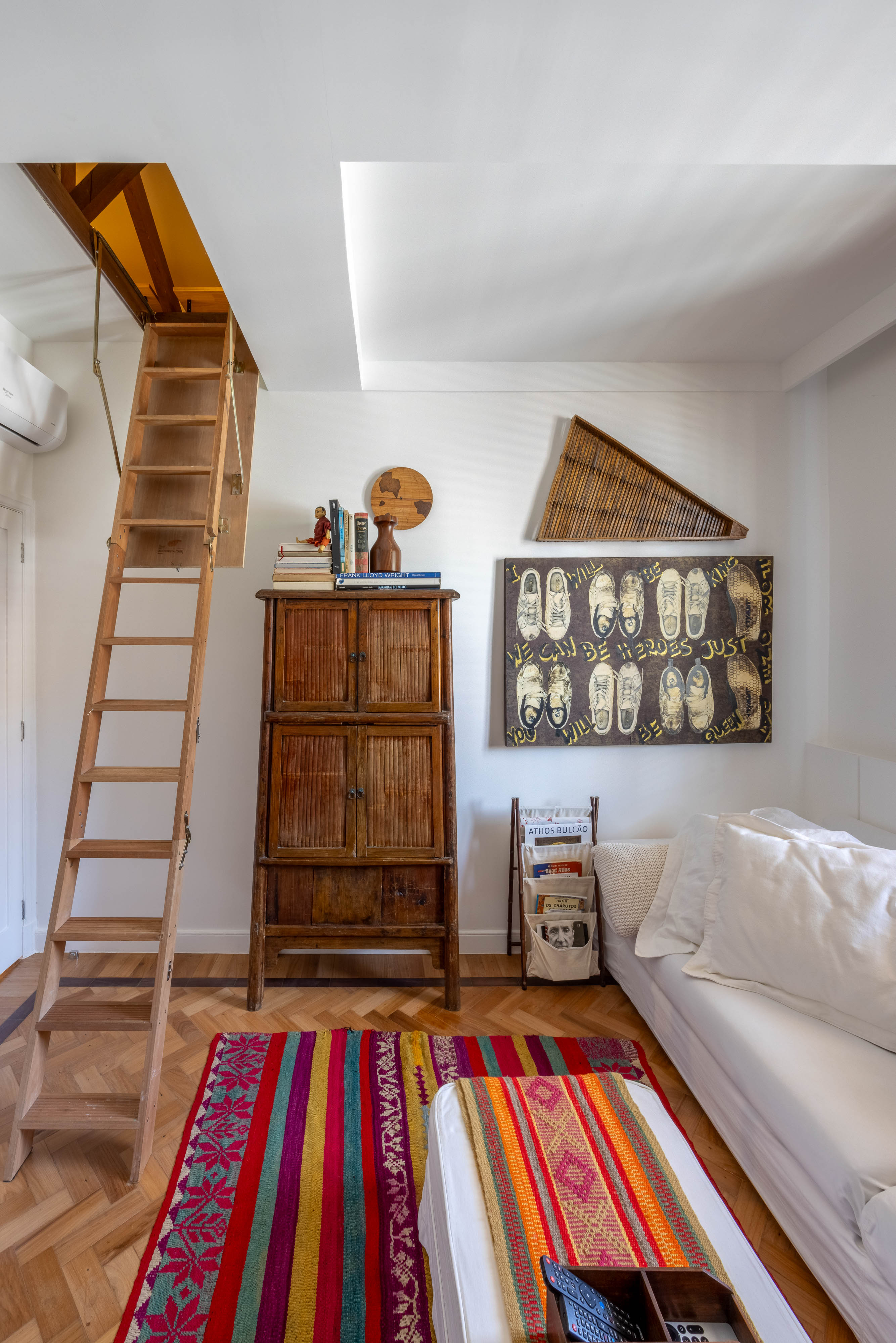 Embora, os lindos janelões em arco roubem a cena, o charme do primeiro andar está também na decoração criada pelo arquiteto com seu próprio acervo. Nada ali é novo. Absolutamente tudo: móveis, tapetes, obras de arte, livros, objetos estava há anos na casa anterior. E, agora foi recriado, numa espécie de versão pocket...