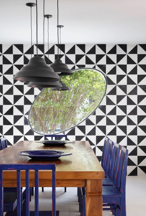 O uso generoso de vidro garante ventilação cruzada, iluminação natural e uma conexão direta com o entorno. Pensamos na ventilação cruzada e iluminação natural, além de uma conexão direta com o entorno. No espaço gourmet, o destaque vai para a parede de ladrilho hidráulico em preto e branco e a abertura oval orgânica, que adiciona um toque de irreverência e leveza à composição.