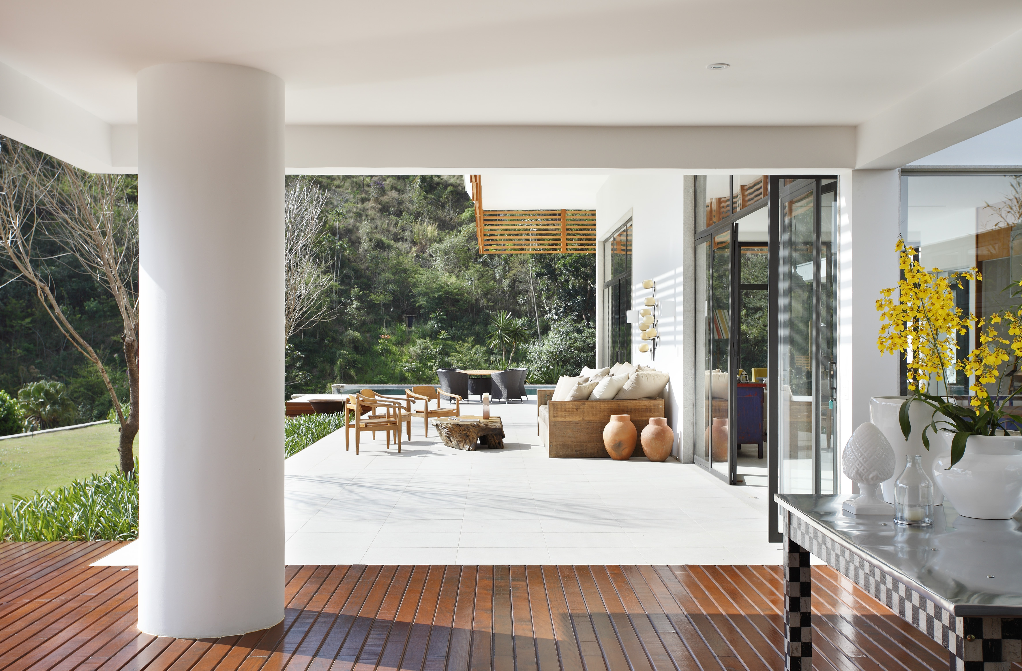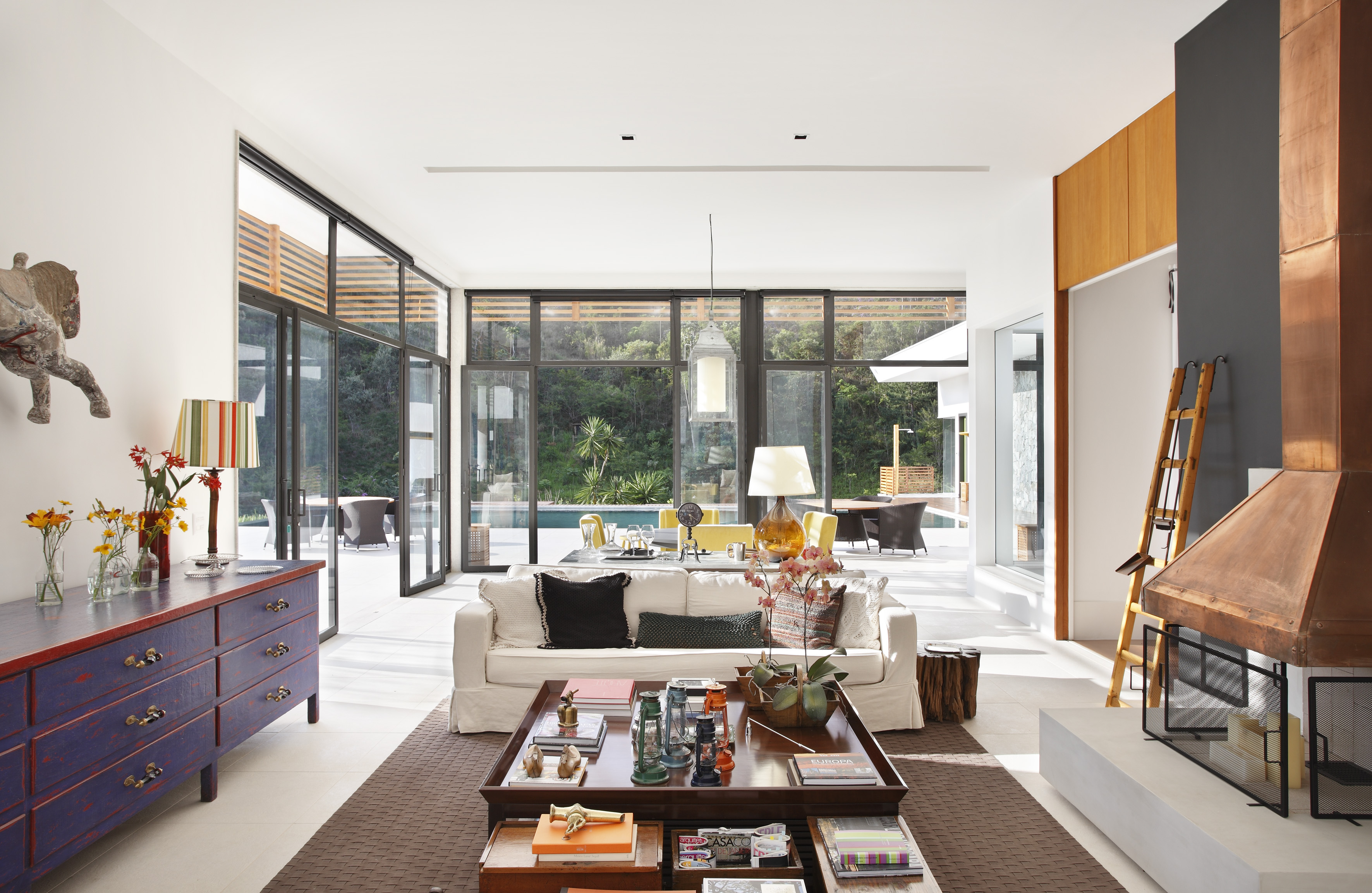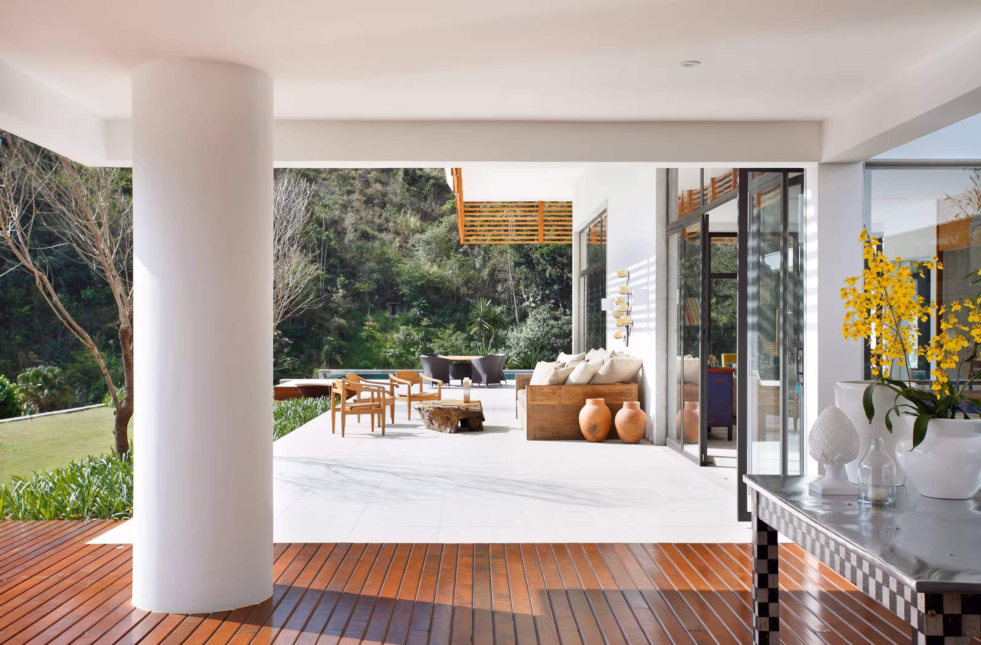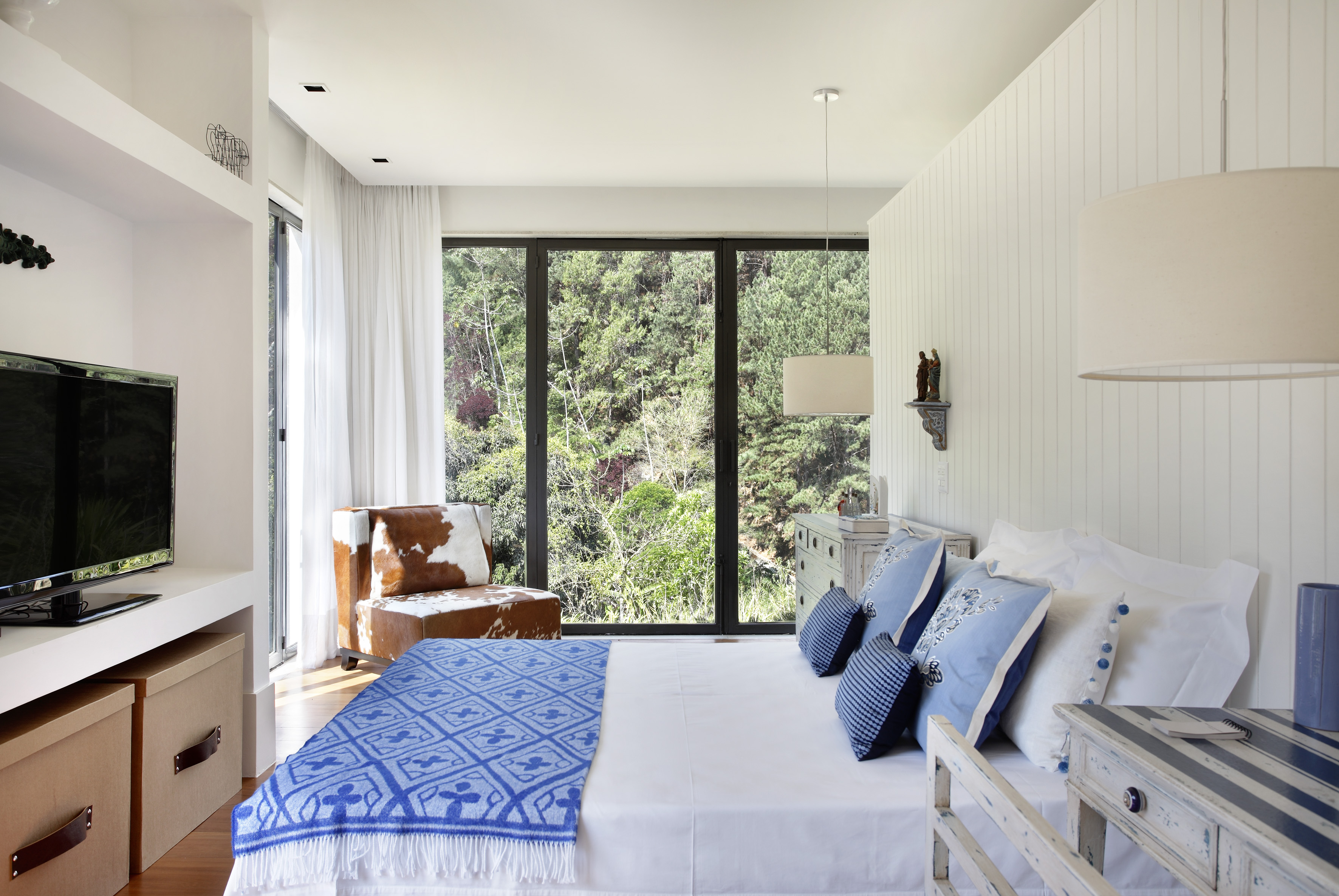 Localizada em Itaipava, na serra do Rio de Janeiro, esta casa de fim de semana foi projetada para uma família que busca conforto, integração e contato com a natureza. Em um terreno amplo e cercado de verde, a construção térrea se estende de forma horizontal, respeitando a topografia e valorizando as vistas para as montanhas. Todas as sete suítes possuem amplas janelas voltadas para a mata, permitindo que a paisagem faça parte do cotidiano e da decoração.