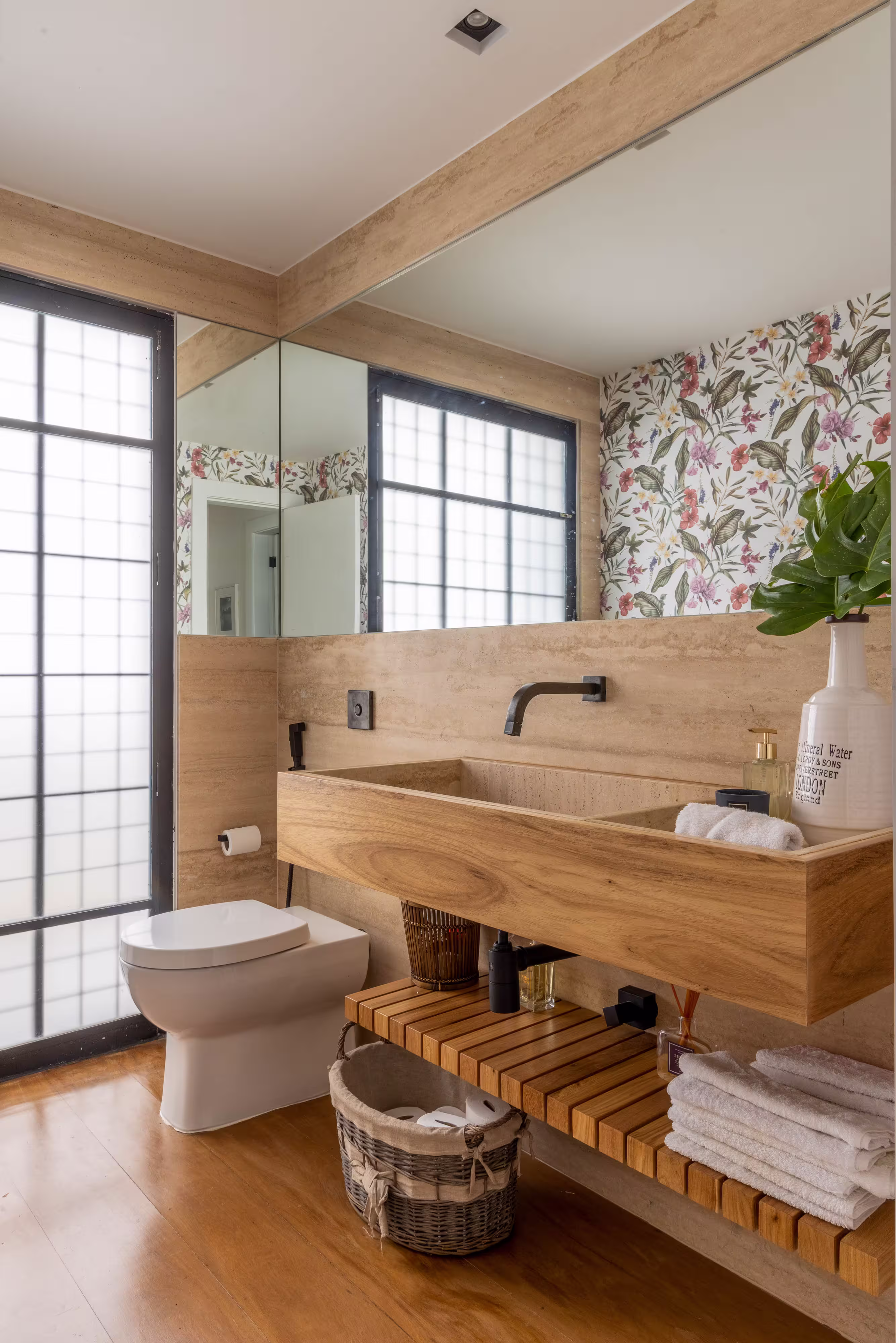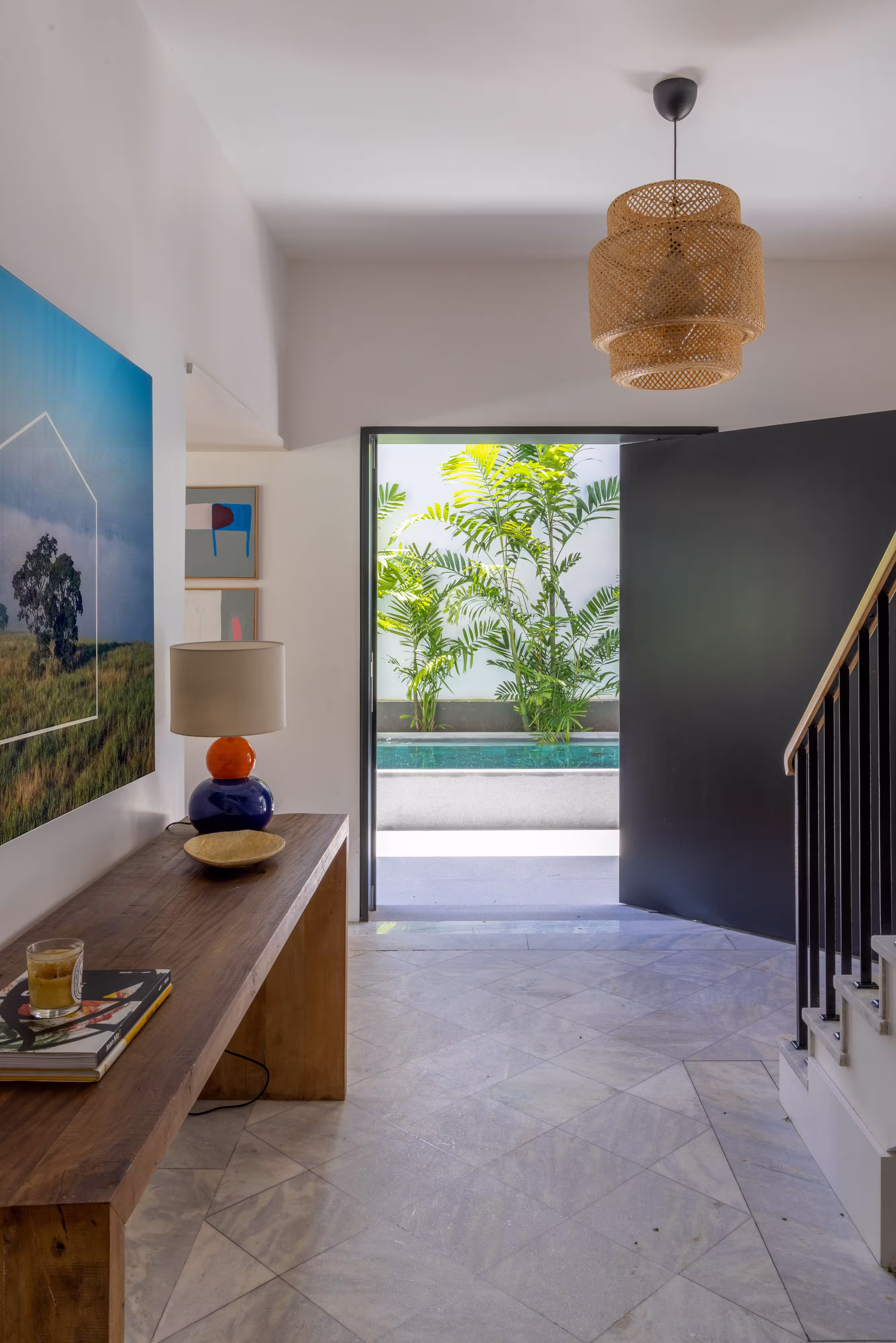 Por ali, nada ficou no lugar: do acesso de pedestres à garagem, tudo foi reformulado. A entrada social ganhou um pergolado, a sala principal foi ampliada e aberta para a área externa - o que exigiu a colocação de uma viga metálica extra incorporada ao projeto de decoração - e o quintal ganhou uma piscina em formato de raia, além de uma escada que dá acesso ao quarto das filhas de Helena, no segundo andar, onde também foi feito um pequeno jardim para as meninas.
