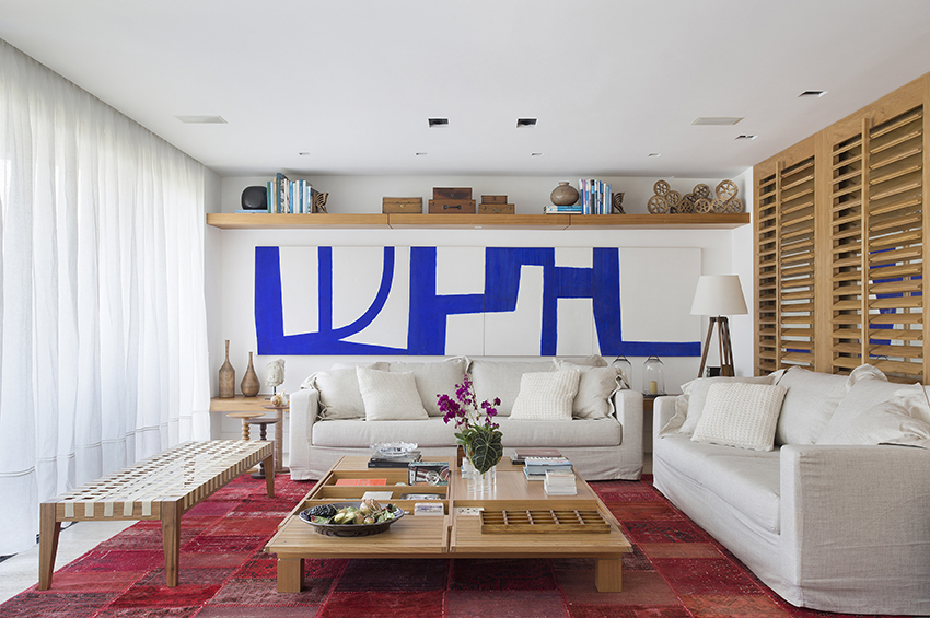 Na sala de estar, sofás claros e poltronas em madeira e couro dialogam com o tapete em tons de vermelho, que adiciona contraste e cor. A área de jantar mantém a mesma linguagem, com mesa em madeira escura, cadeiras em couro caramelo e pendentes brancos que garantem uma iluminação uniforme e agradável.