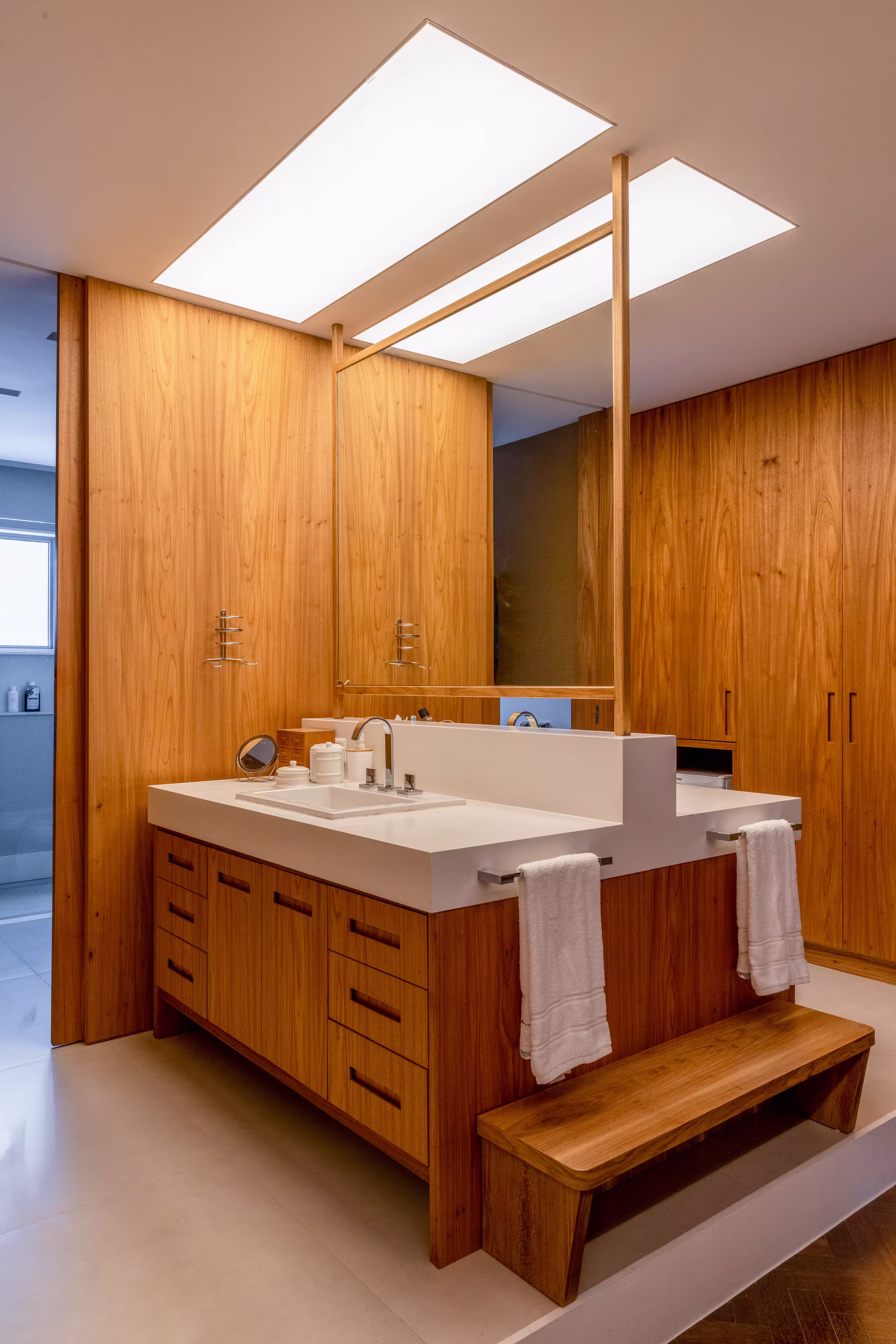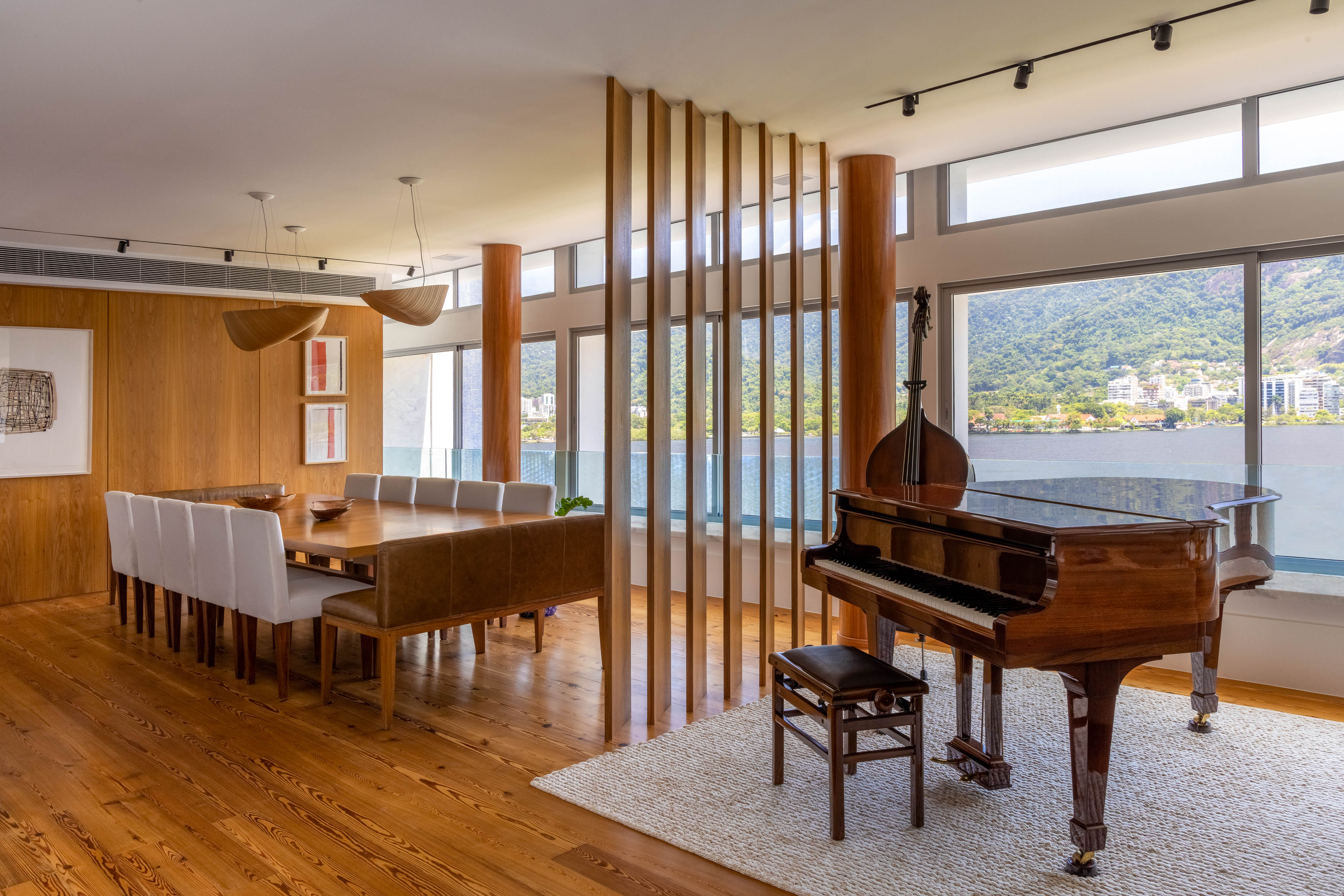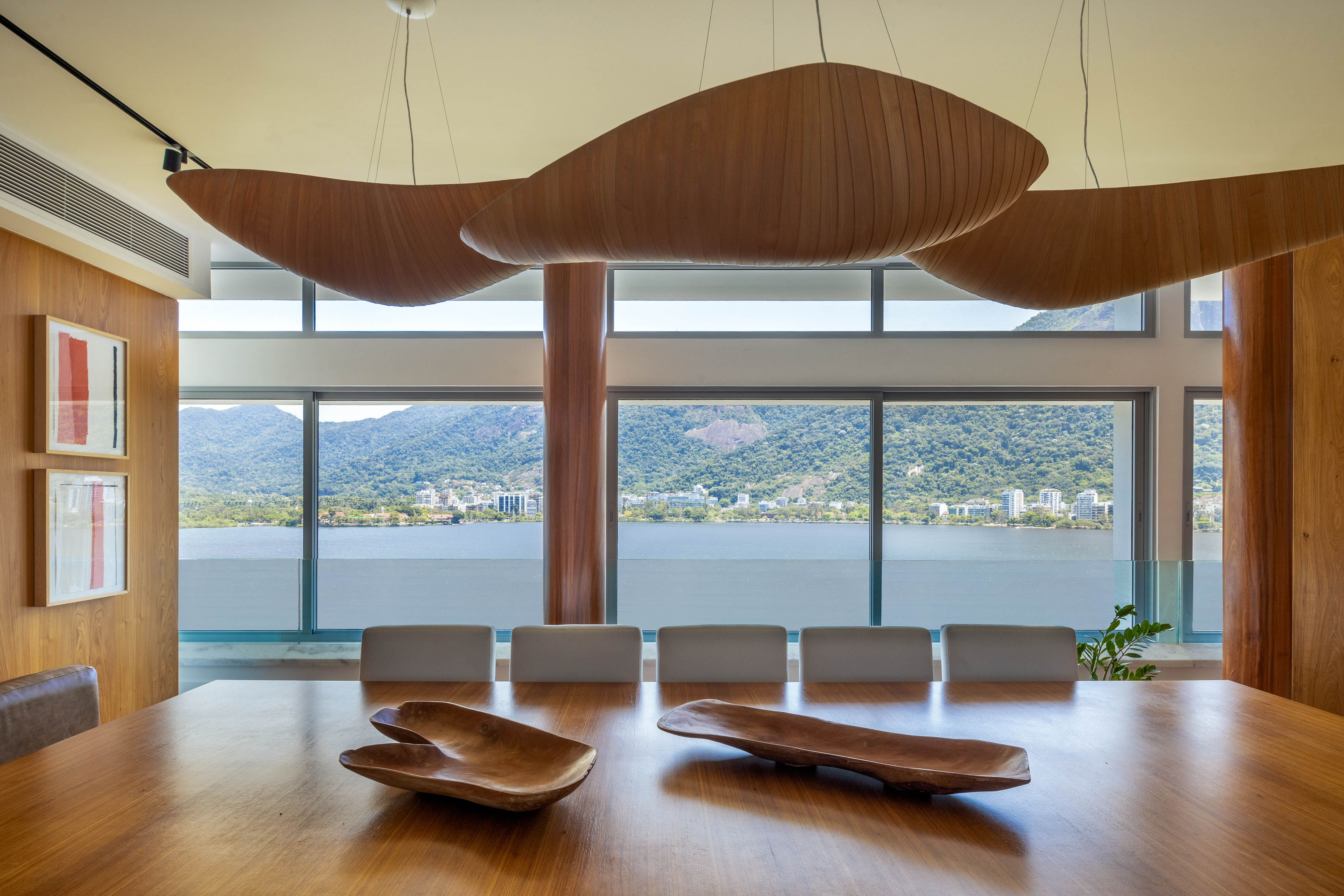 A decoração mudou completamente. Um detalhe acrescentado pelo arquiteto foi o uso da madeira peroba, que aparece em praticamente todos os ambientes: em painéis, brises e até no revestimento dos pilares da sala, por exemplo; e, também, no quarto principal e banheiros. Já o mobiliário foi reaproveitado do antigo apartamento dos moradores. Também reformado por Maurício há cerca de dez anos: