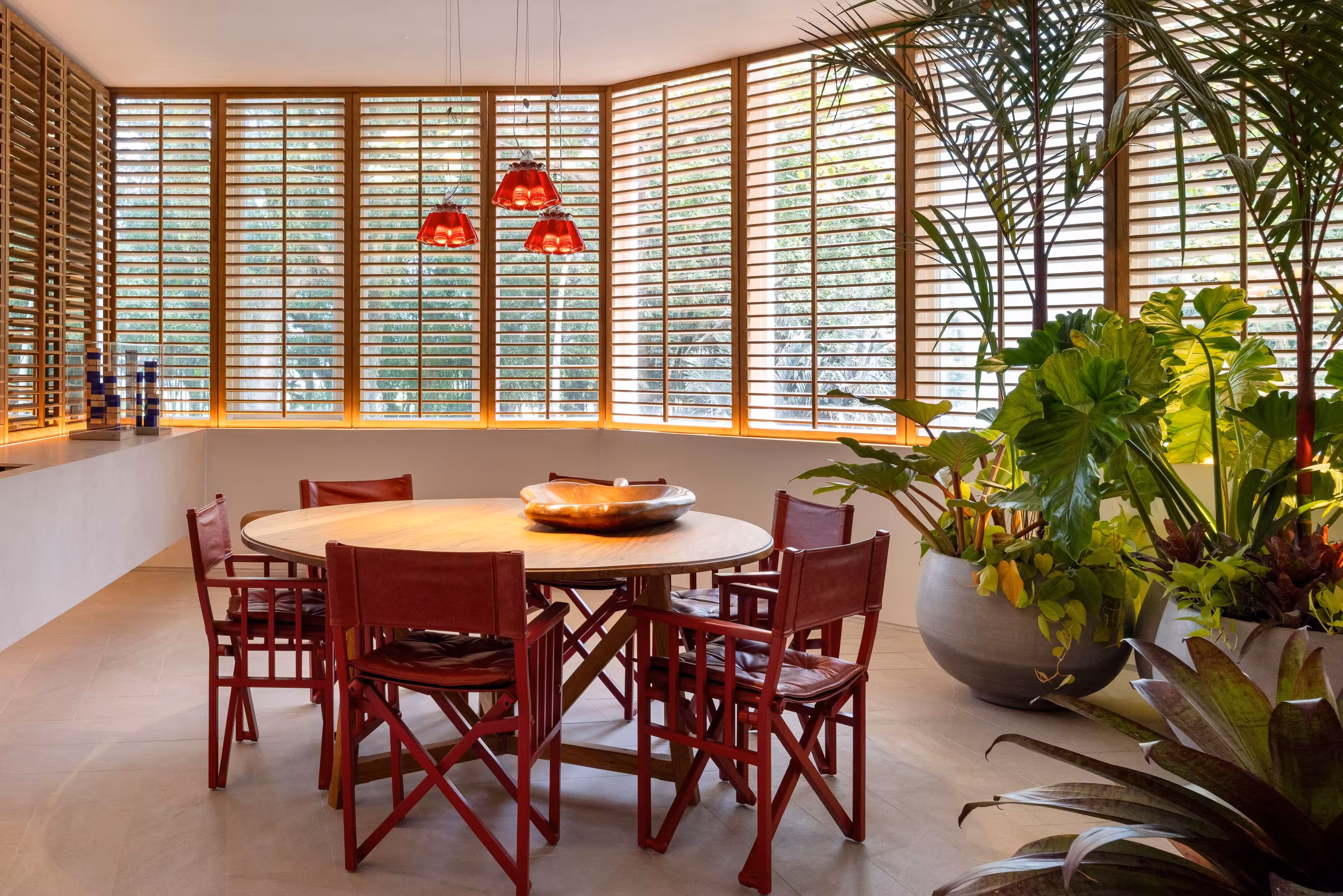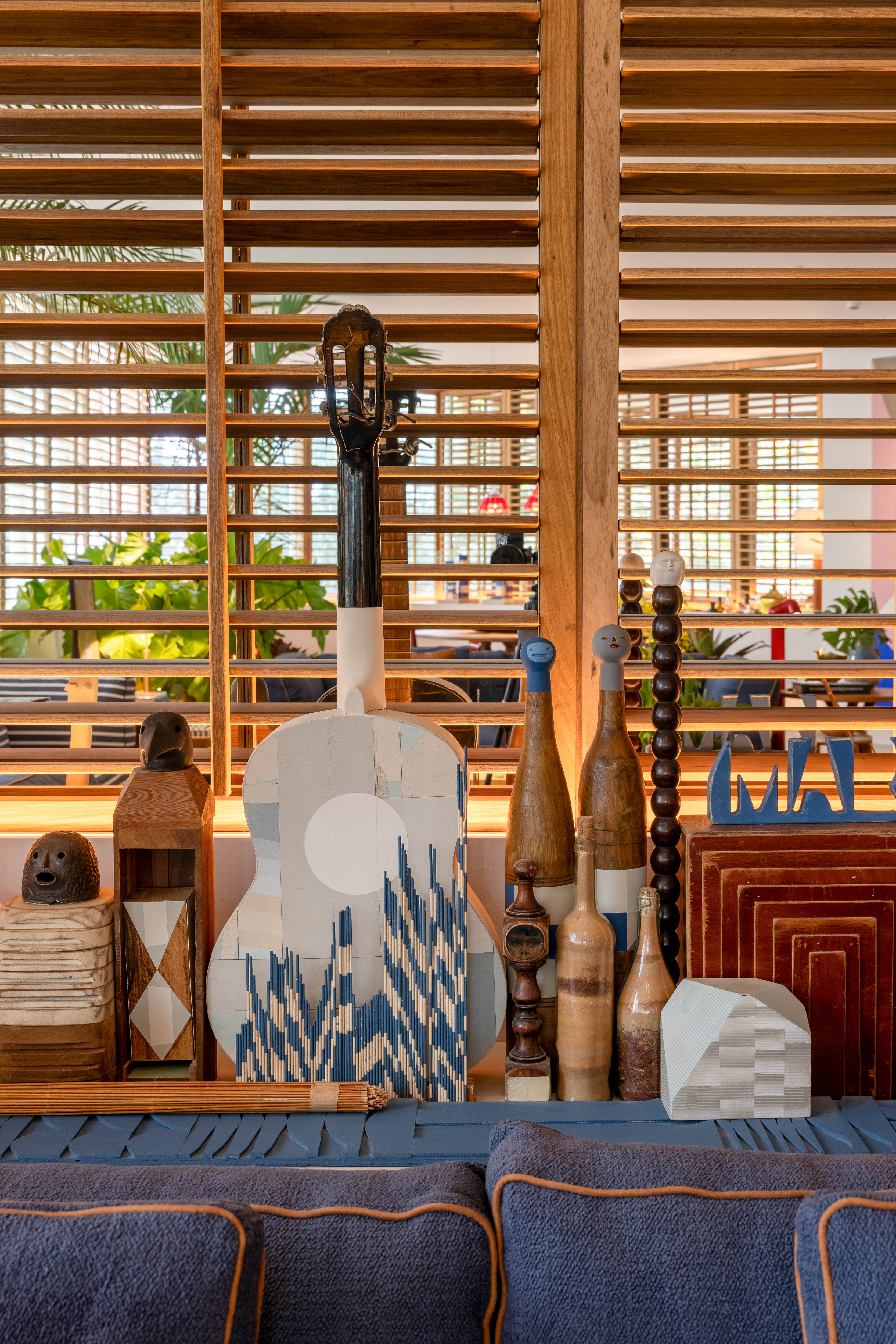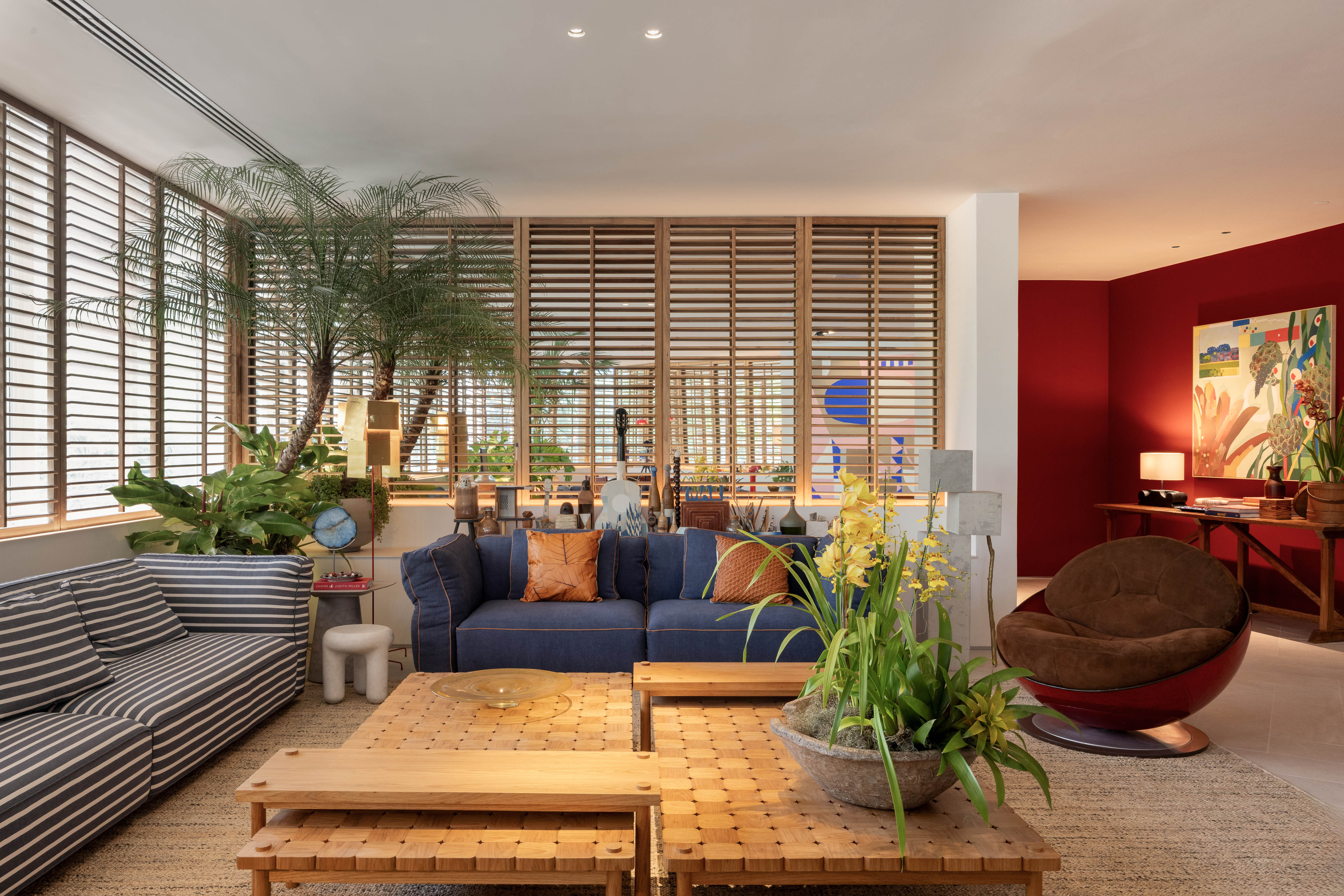 Um living bem carioca: leve, solar, iluminado e repleto de referências. Aqui, peças artesanais, materiais naturais, mobiliário contemporâneo e o mix de texturas criam um design atemporal que convida ao convívio. Afinal, é um espaço para receber os amigos. Um jogo de espelhos nas paredes laterais traz para o interior o verde das copas das árvores. Enquanto shutters de madeira deixam o ambiente aconchegante e com temperatura agradável. A seleção de arte traça uma ponte aérea Rio-Lisboa, com obras de brasileiros como Antonio Bokel, Mateu Velasco e Marcelo Macedo, que vivem e expõem entre Brasil e Portugal.
