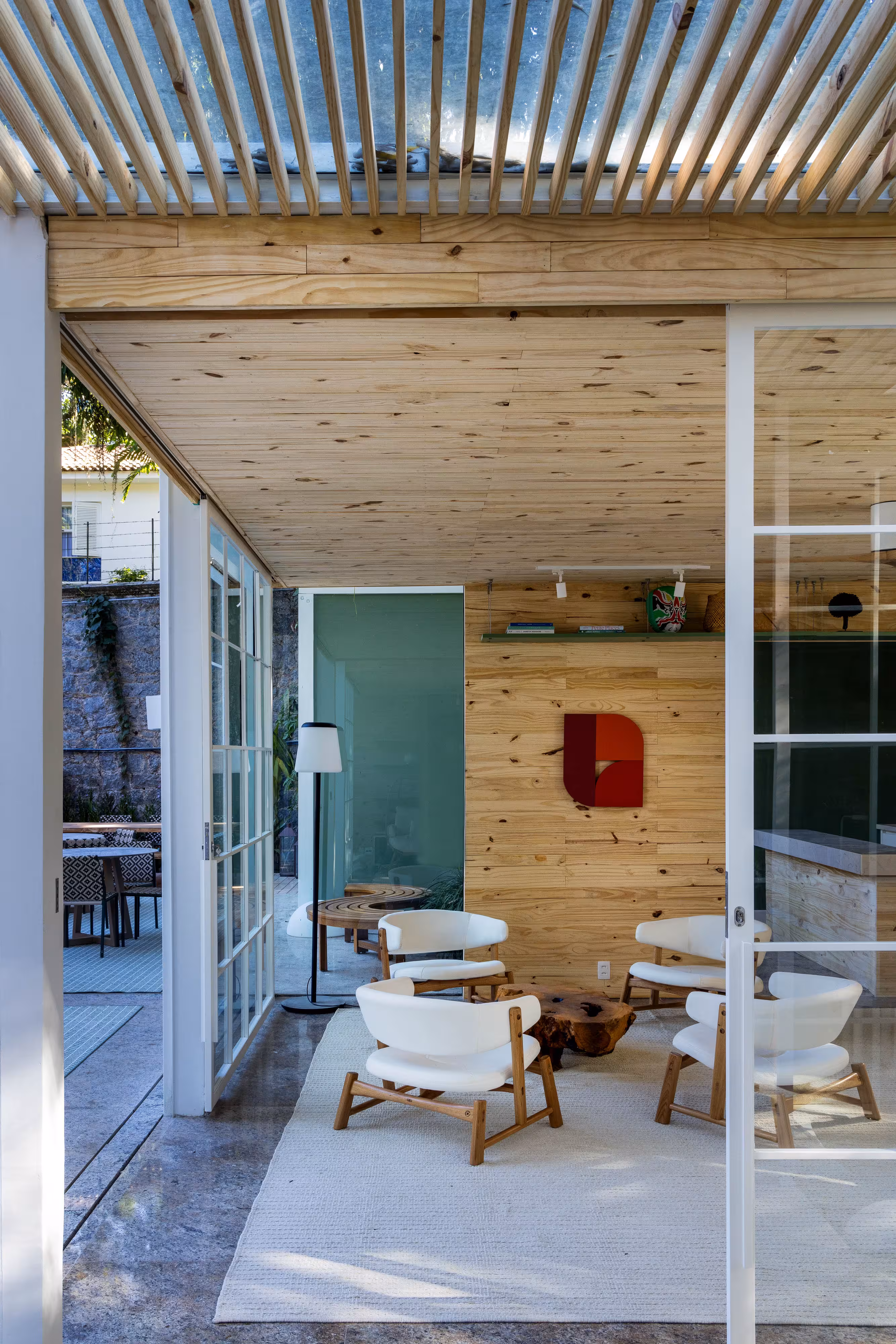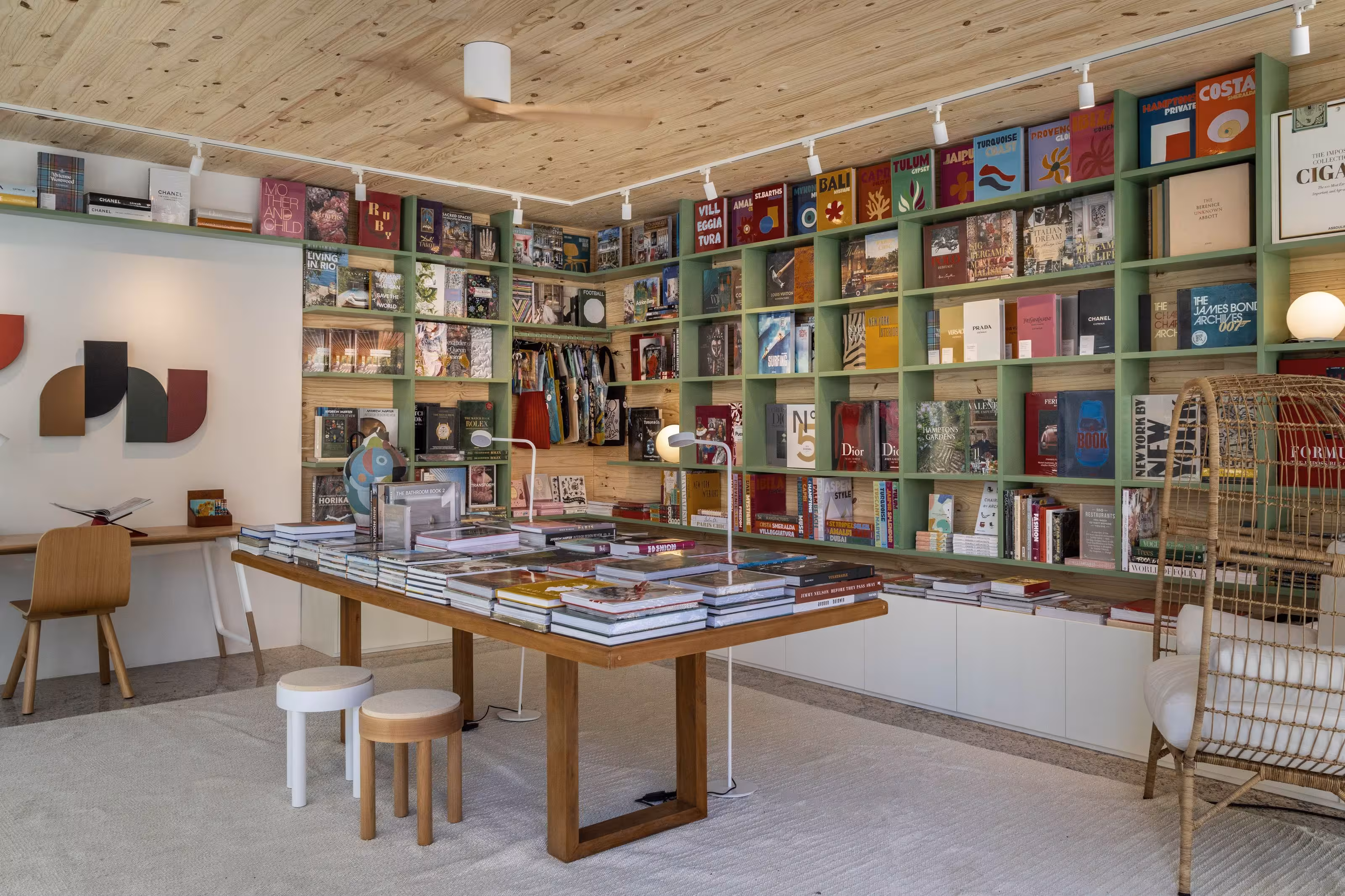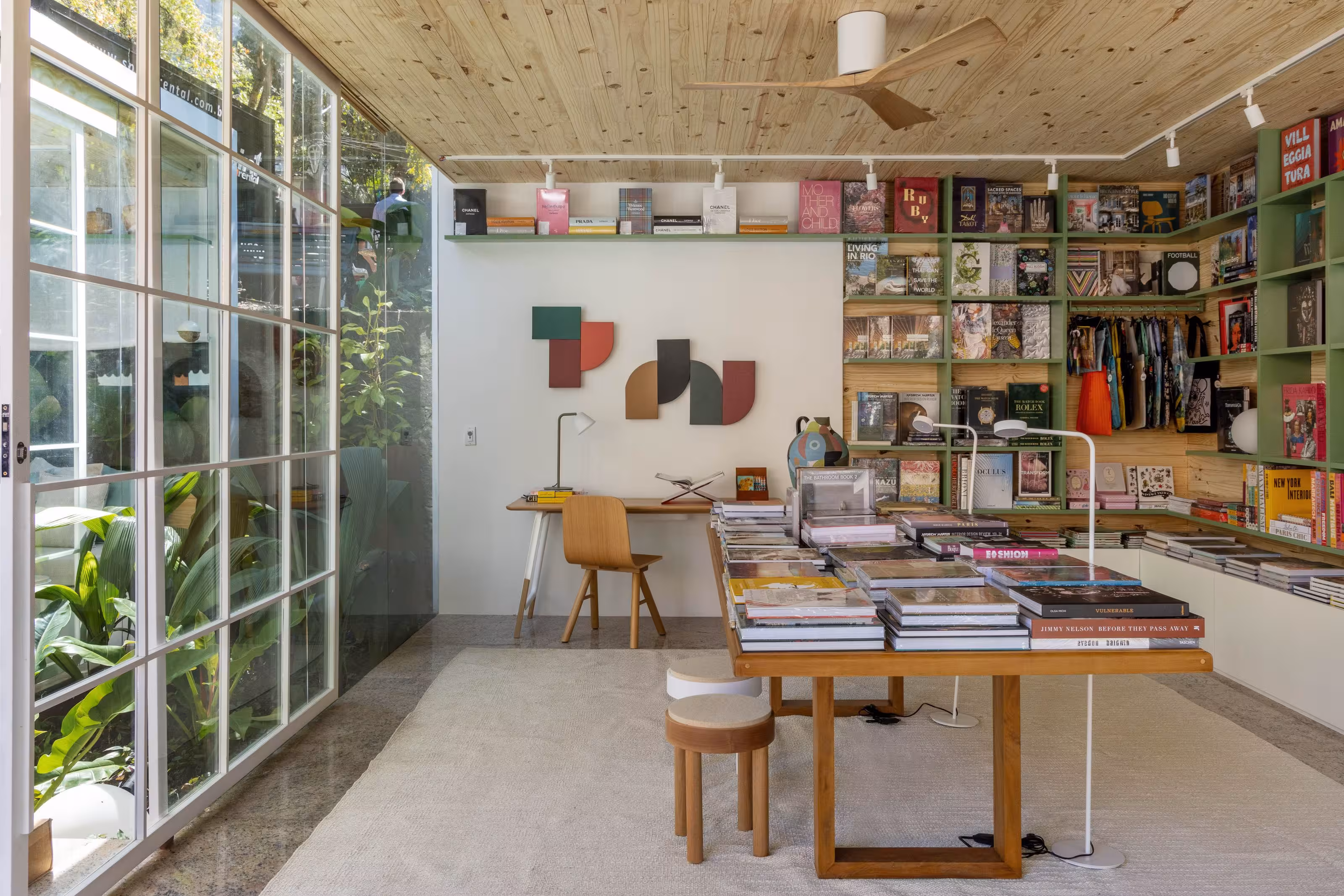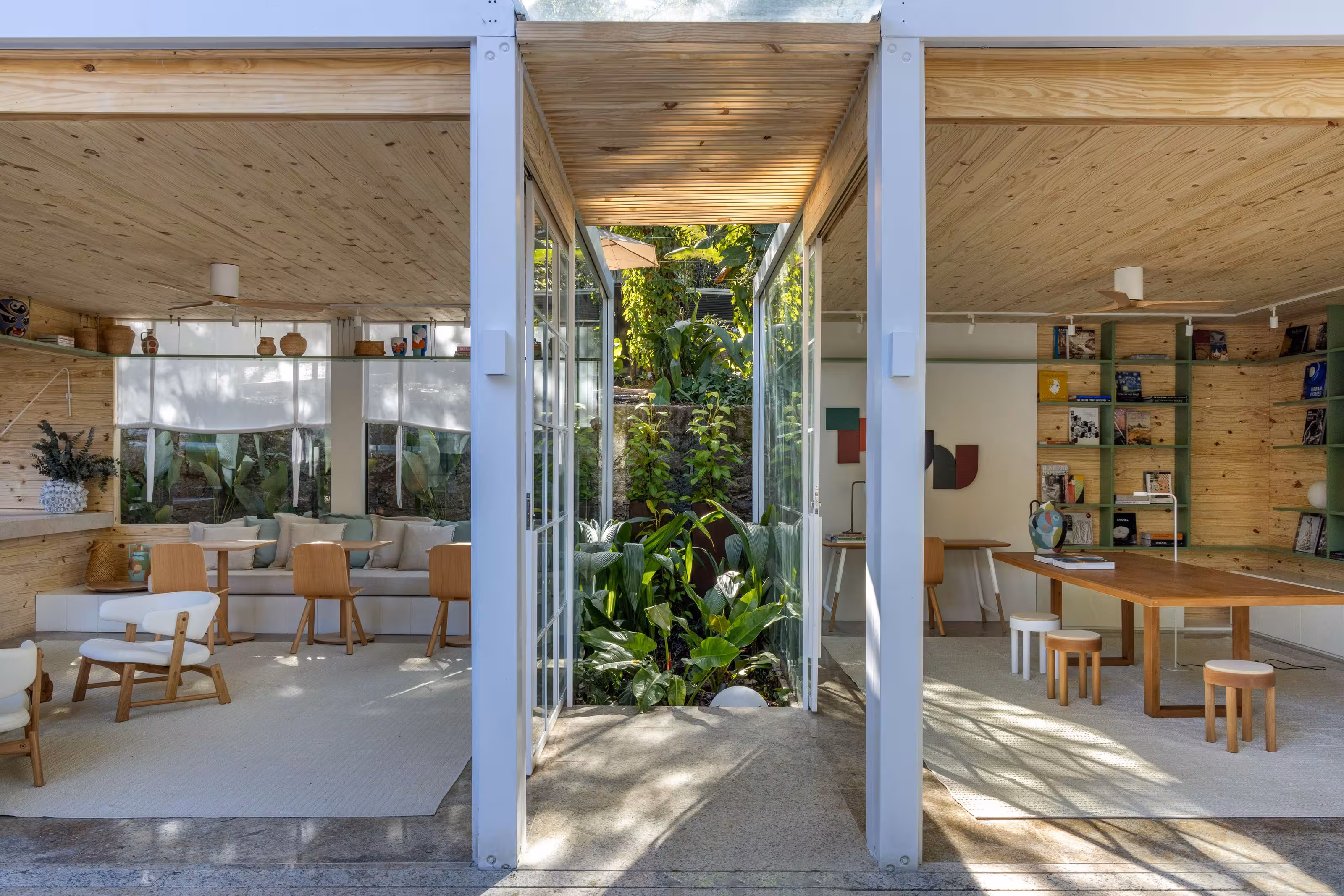 Um ambiente dois em um. É café. É livraria. E ainda tem uma charmosa área externa onde nossos visitantes podem curtir um fim de tarde ou café da manhã (aos fins de semana) em meio ao verde do jardim. Construído em três contêineres, o espaço ganhou revestimento de pinus de reflorestamento que ajuda a trazer um ar mais aconchegante aos ambientes criando um clima quase de quintal de casa. A decoração criada por Mauricio Nóbrega, Bia Wolff, Maria Estellita e Patricia Vieira aposta em móveis e tecidos de tons claros e remete a uma cabana de praia. Afinal, estamos no Rio.