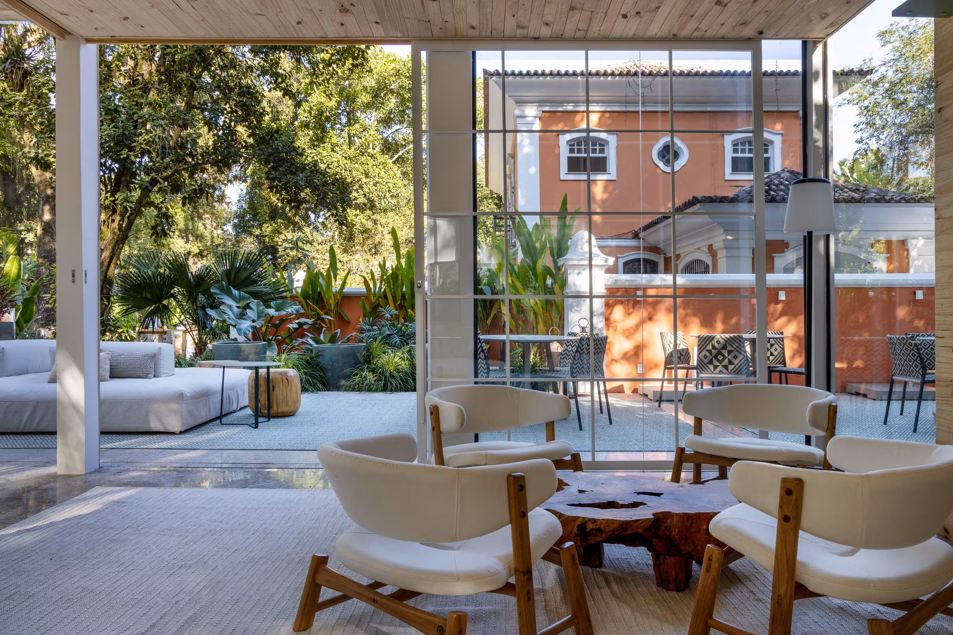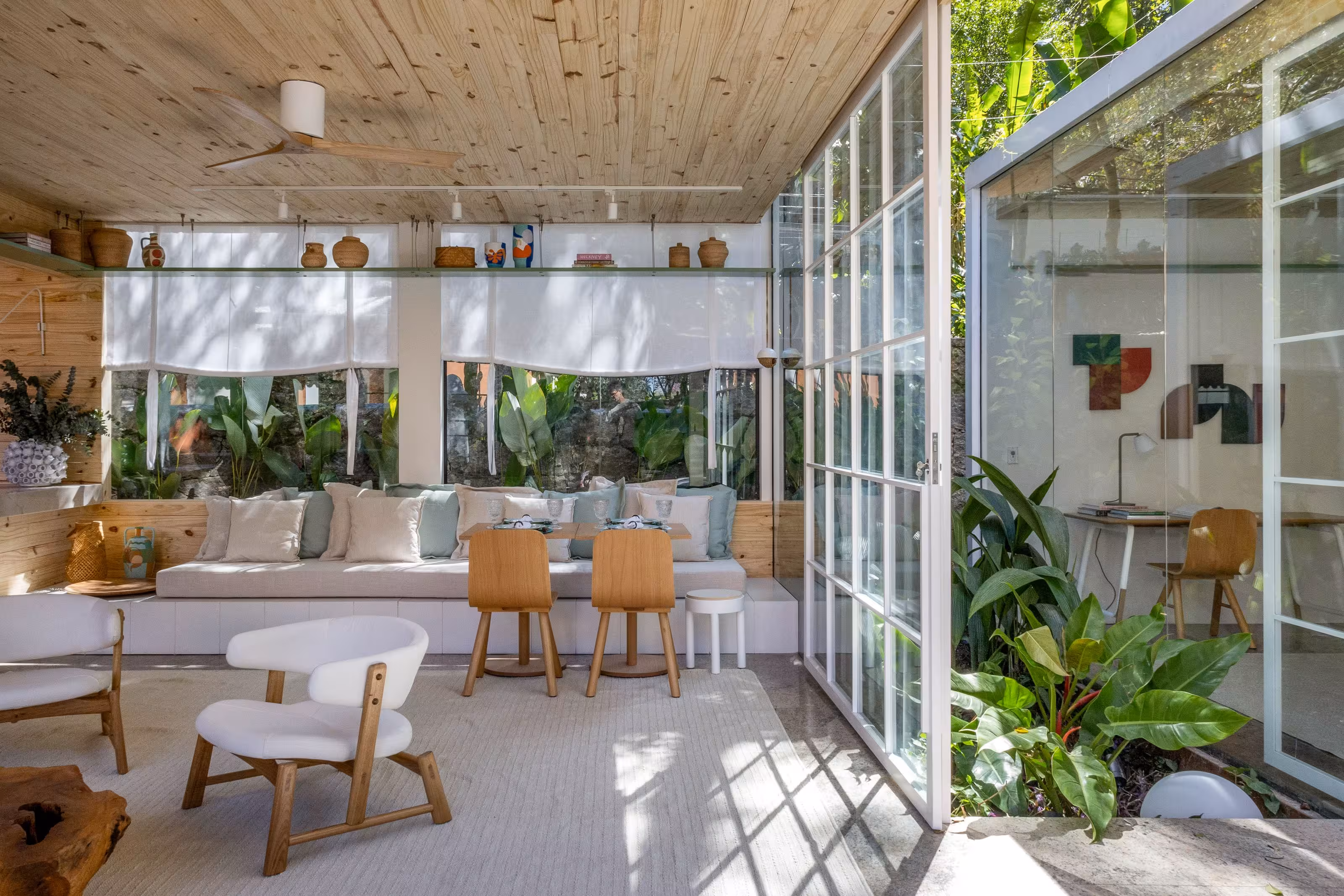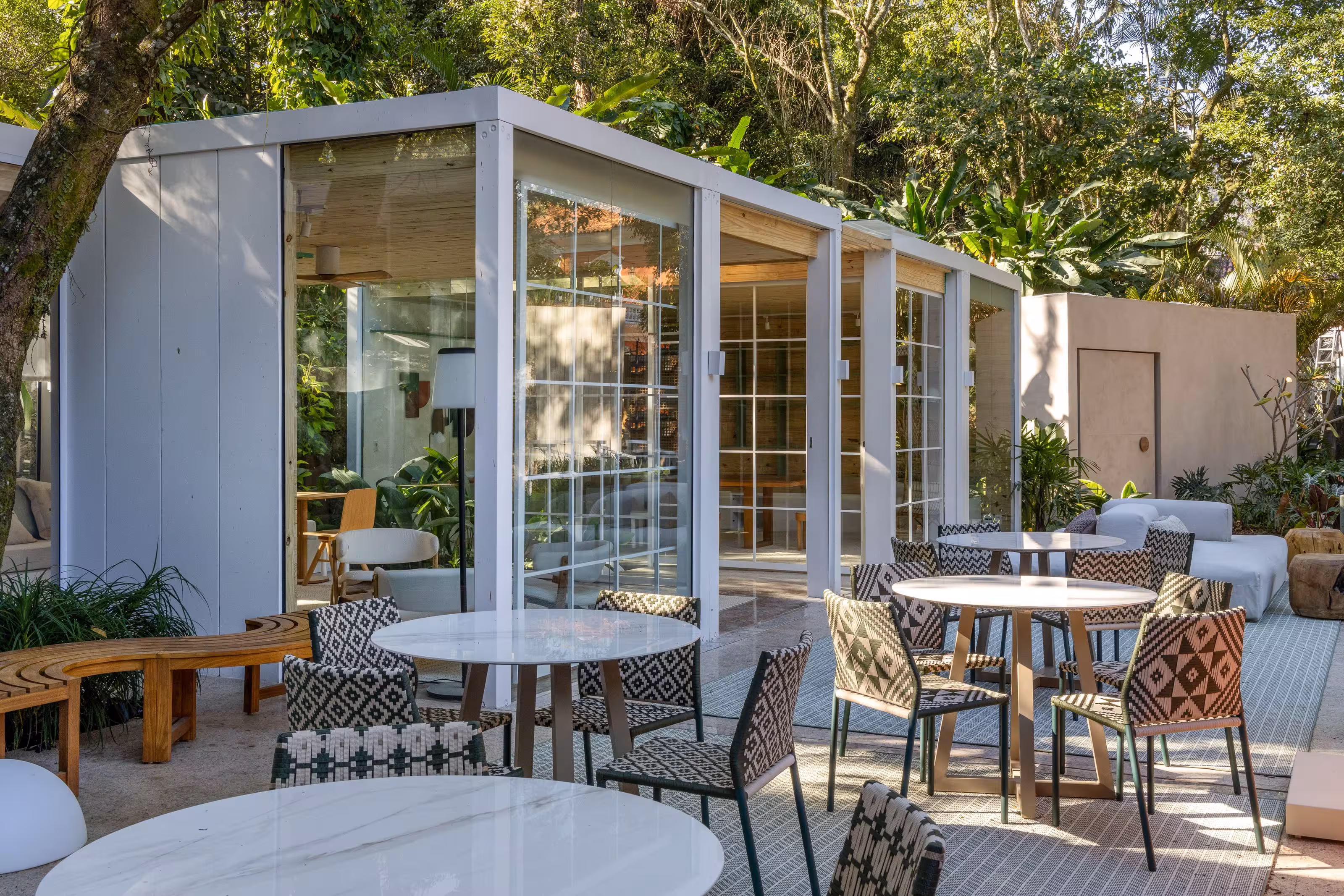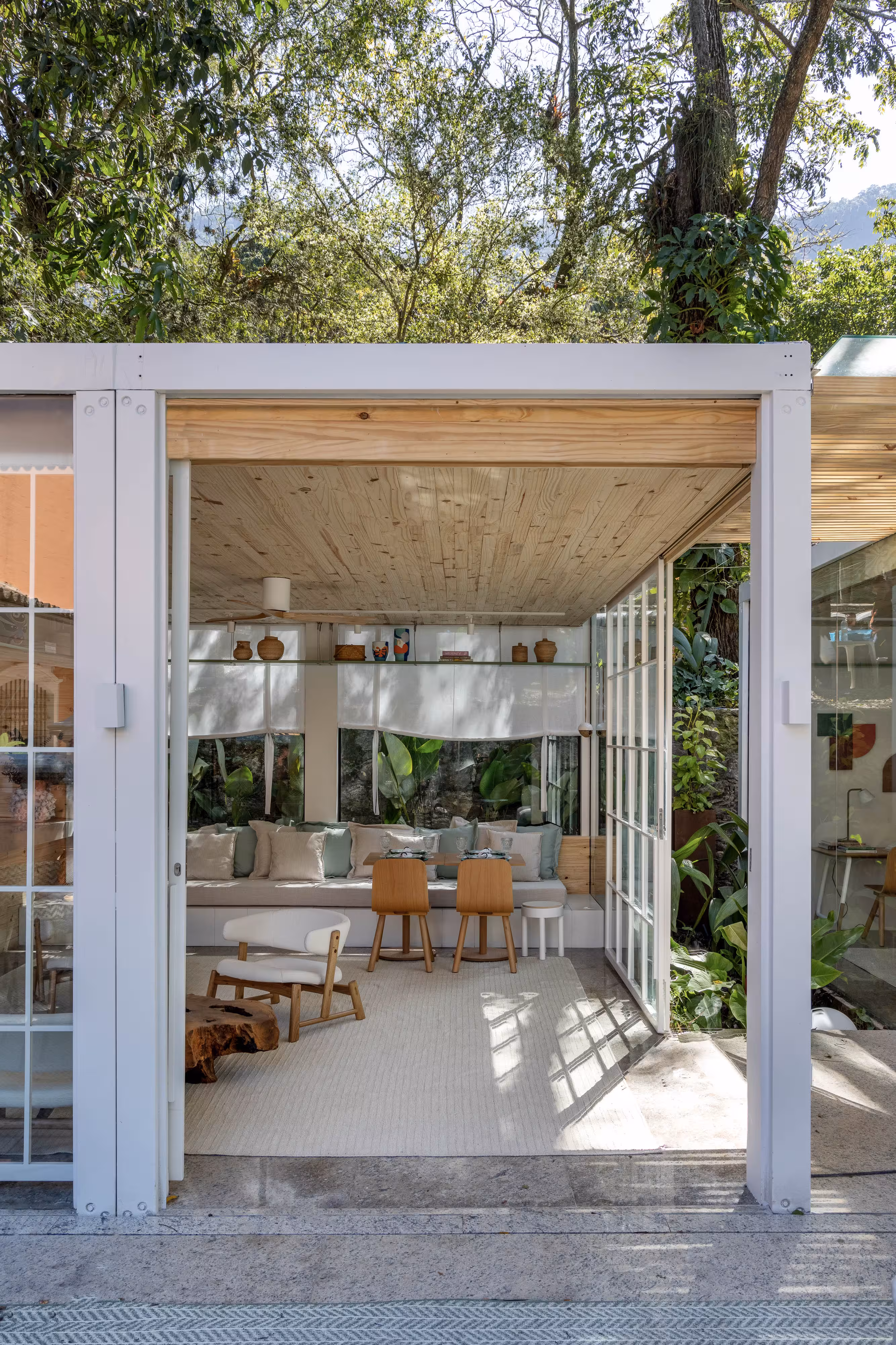 Um ambiente dois em um. É café. É livraria. E ainda tem uma charmosa área externa onde nossos visitantes podem curtir um fim de tarde ou café da manhã (aos fins de semana) em meio ao verde do jardim. Construído em três contêineres, o espaço ganhou revestimento de pinus de reflorestamento que ajuda a trazer um ar mais aconchegante aos ambientes criando um clima quase de quintal de casa. A decoração criada por Mauricio Nóbrega, Bia Wolff, Maria Estellita e Patricia Vieira aposta em móveis e tecidos de tons claros e remete a uma cabana de praia. Afinal, estamos no Rio.