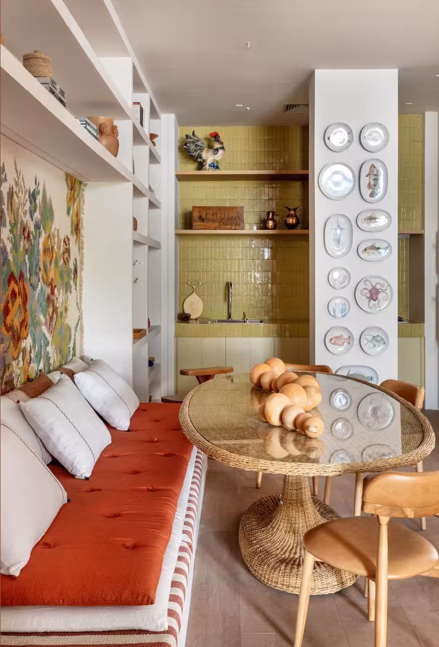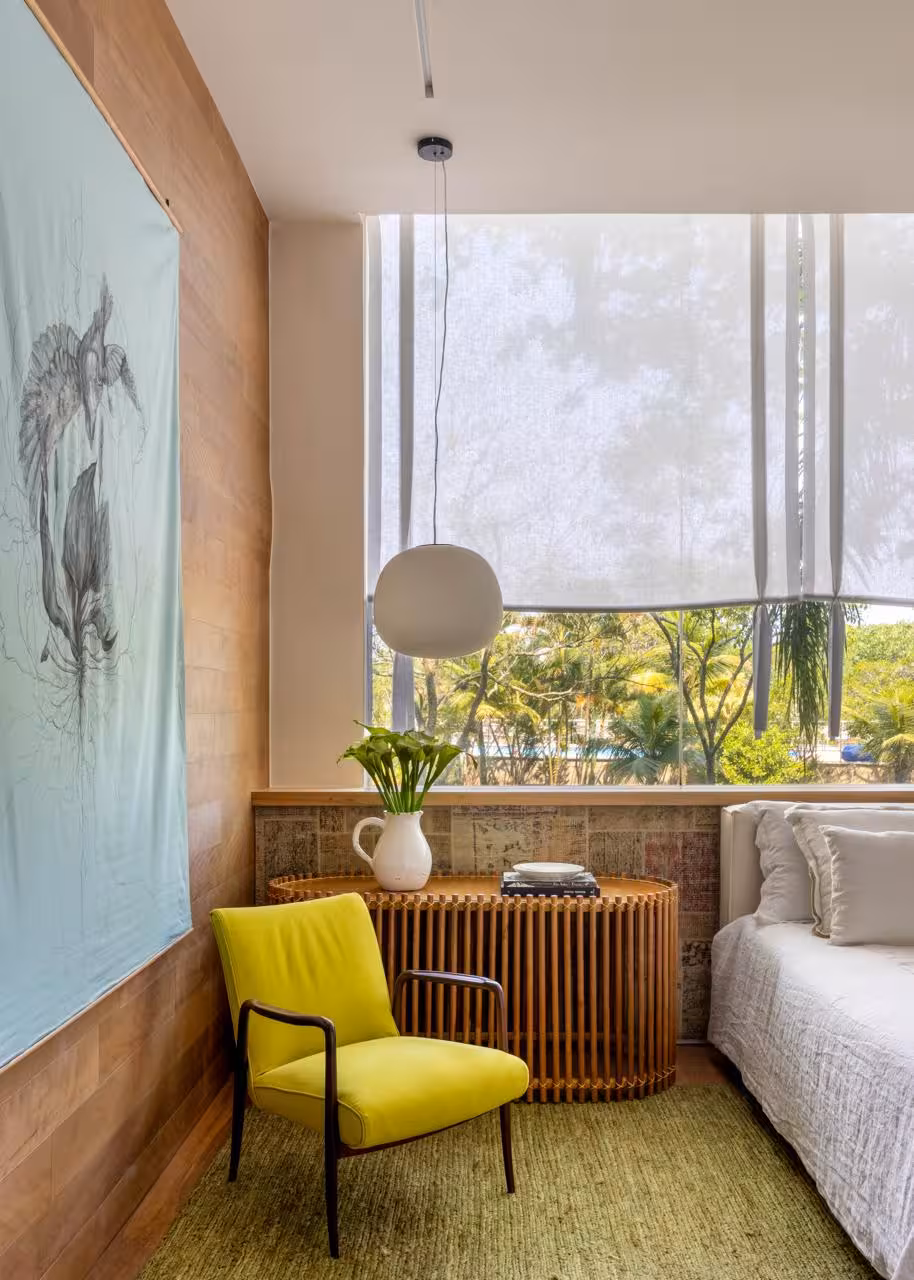 O arquiteto Maurício Nóbrega participa pela 31ª vez na CASACOR Rio, sempre imprimindo um estilo carioca e despojado em seus projetos. Para o loft Perto do Mar, Mauricio Nóbrega Arquitetura criou um projeto atemporal, com ambientes que exalam a leveza e o frescor de uma casa na praia. O revestimento é quase todo em peroba dourada de demolição, tanto no piso como na parede. A exceção são as áreas molhadas da cozinha e banheiro que ganharam uma mesma cerâmica artesanal em tom pistache. Já a decoração traz uma vibe hi-lo com tapeçarias da Hathi em fibras naturais como juta e lã - inclusive penduradas na parede como quadro, usadas na cabeceira da cama -, além de móveis e objetos garimpados que vão de cestarias a uma poltrona anos 1950 de Joaquim Tenreiro. Merecem destaque uma mesa oval Saarinen revestida em vime e uma coleção de pratos de peixes de Gustavo Portella e alguns objetos de memória afetiva que vieram da casa do arquiteto como um barco gigante, remos de barco. A imponente estante foi feita em gesso cartonado. A seleção de arte é criteriosa e traz um interessante mix. “Essa mistura foi fundamental para trazer sofisticação e personalidade ao loft”.