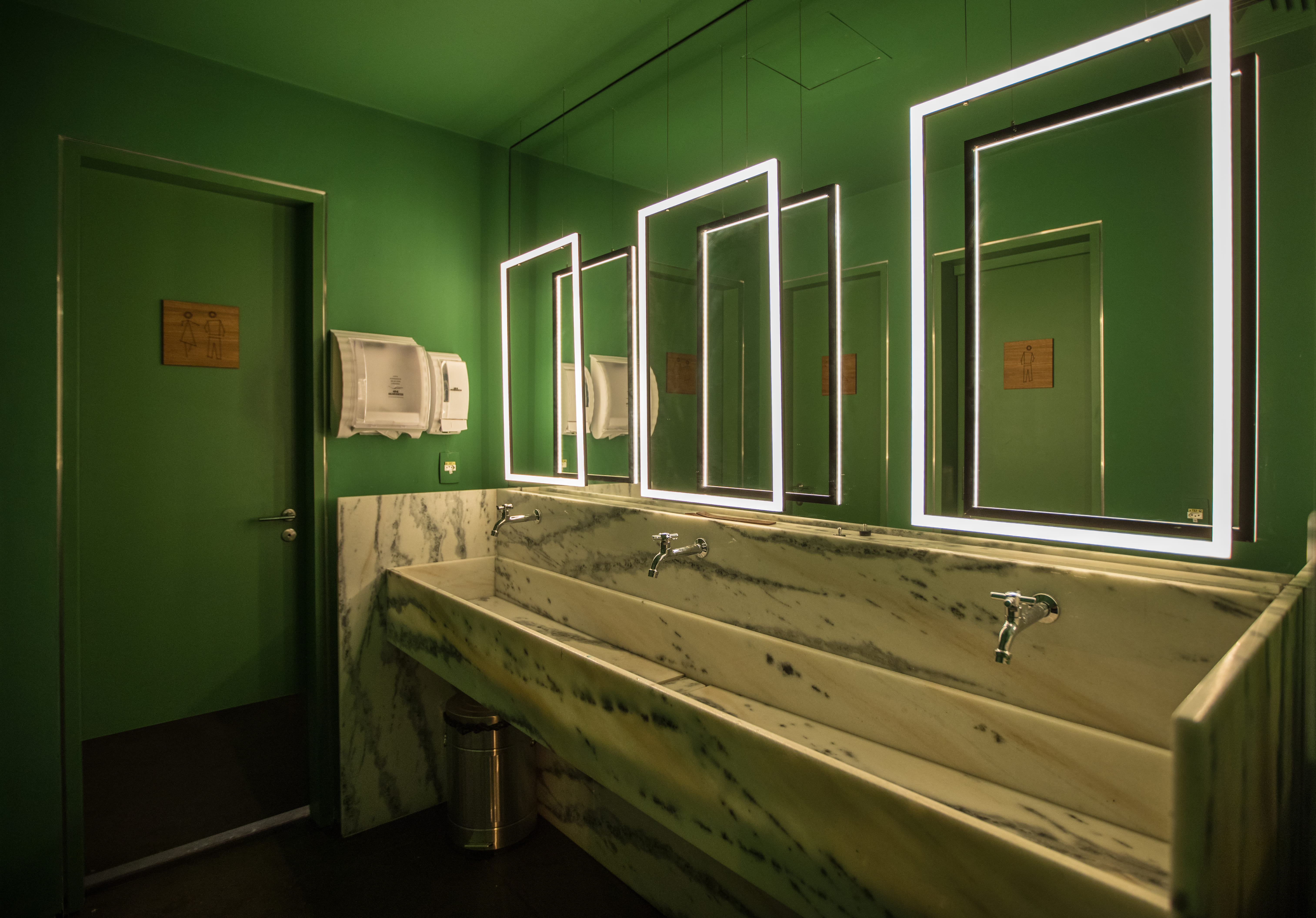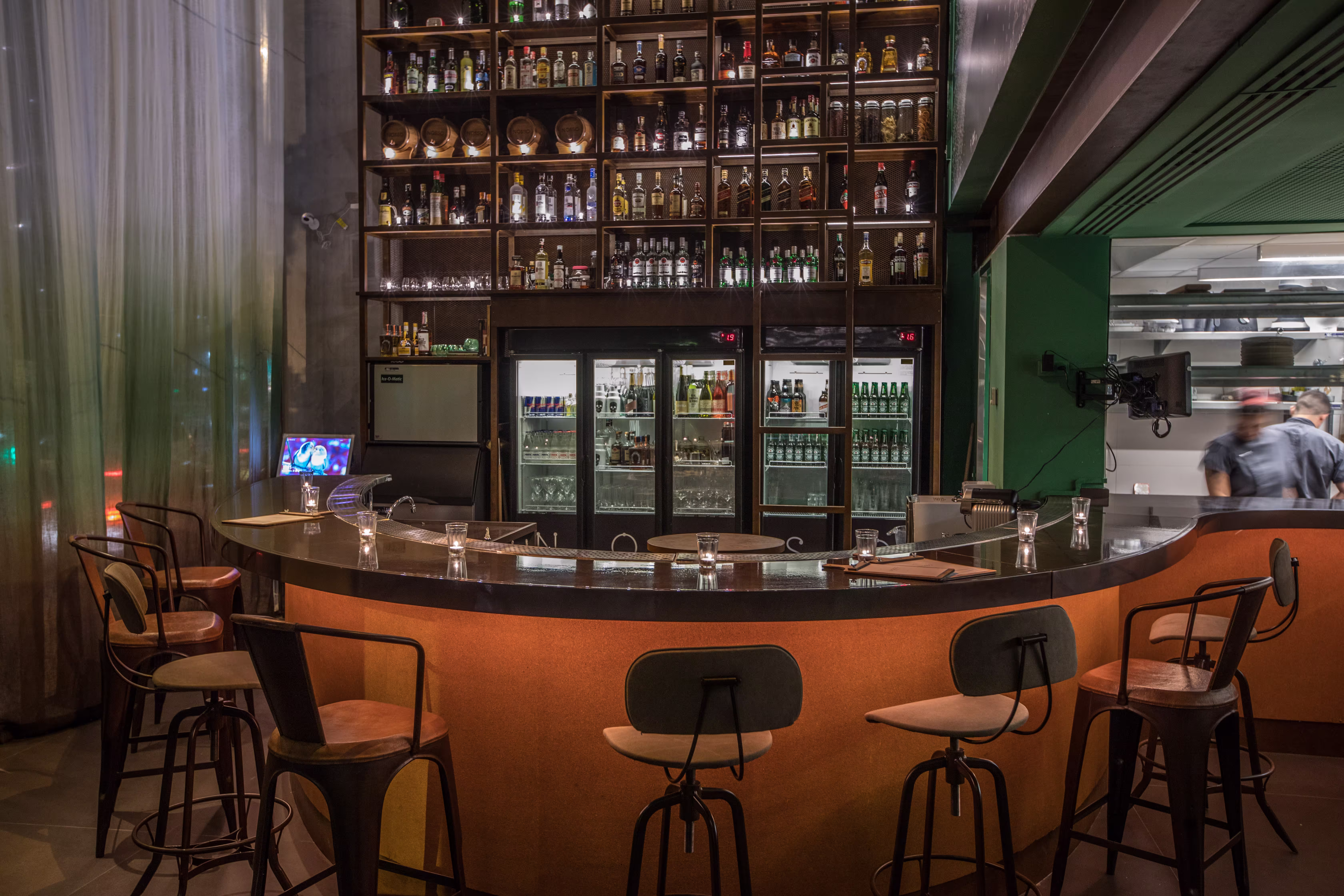 A estética mistura materiais brutos e acabamentos refinados: concreto aparente, madeira escura e toques de cobre contrastam com o verde intenso das paredes e o brilho suave da iluminação ambiente. O bar, de linhas curvas e grande escala, se impõe como elemento central do espaço — um verdadeiro palco da mixologia, com prateleiras verticais que alcançam o pé-direito duplo e abrigam garrafas como esculturas.