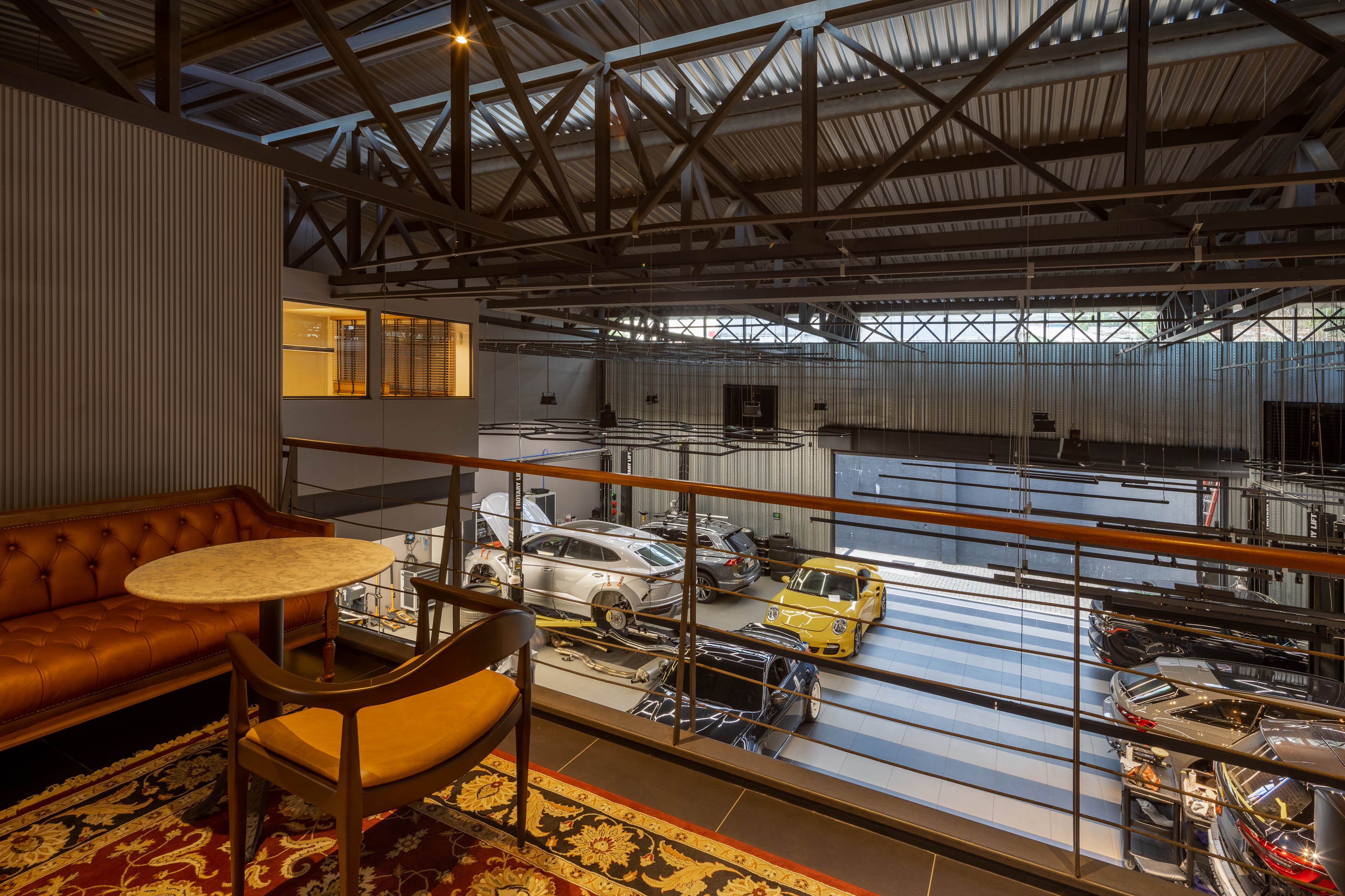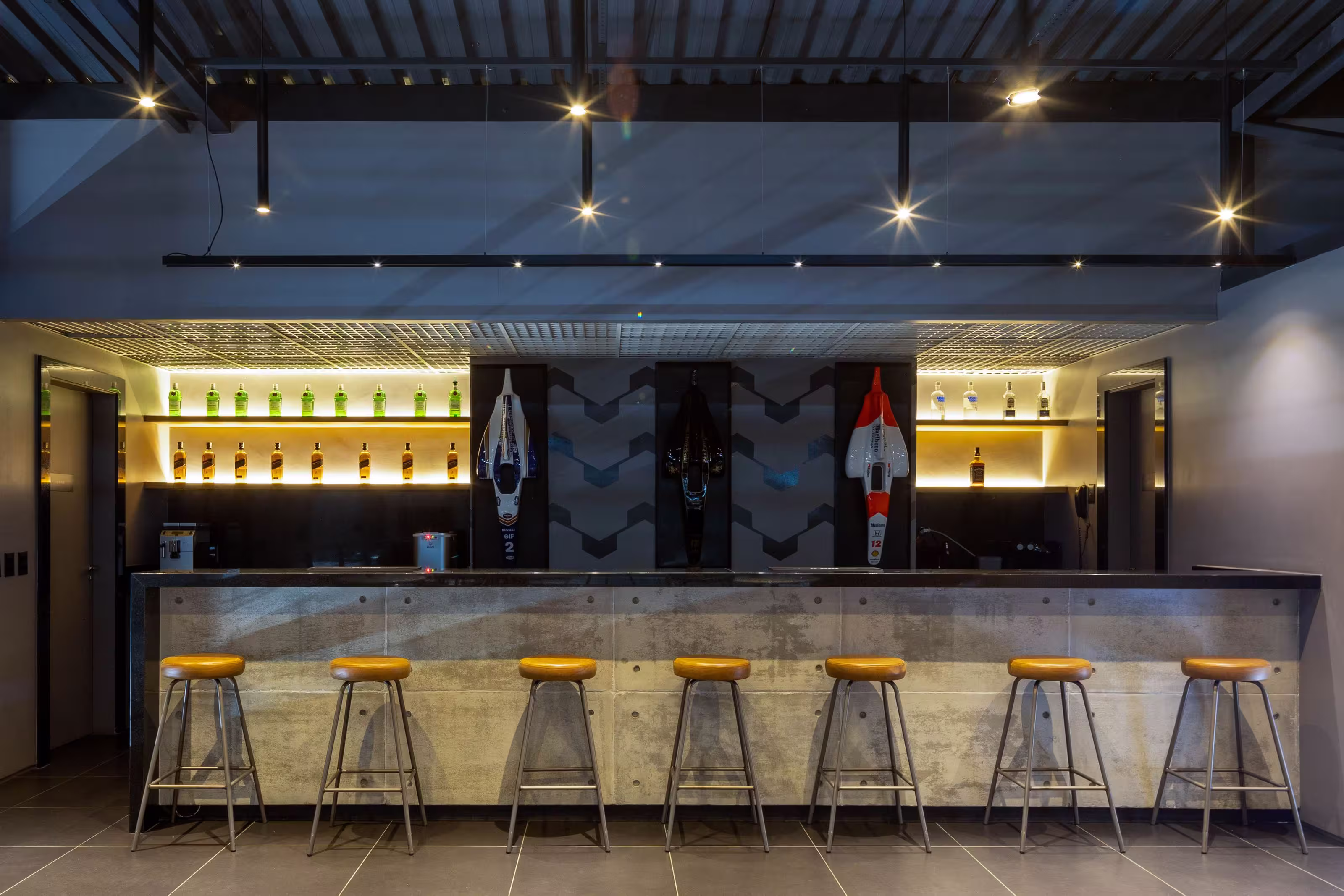 Com estrutura metálica aparente, pé-direito generoso e iluminação cenográfica cuidadosamente planejada, o galpão foi concebido para valorizar o trabalho técnico e a beleza das máquinas.